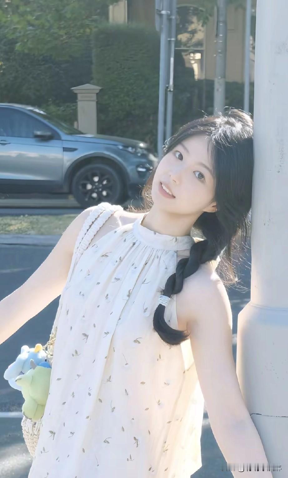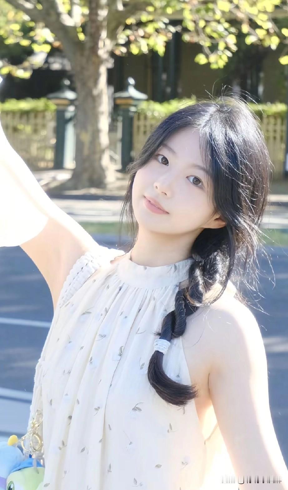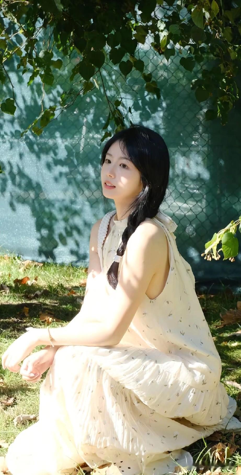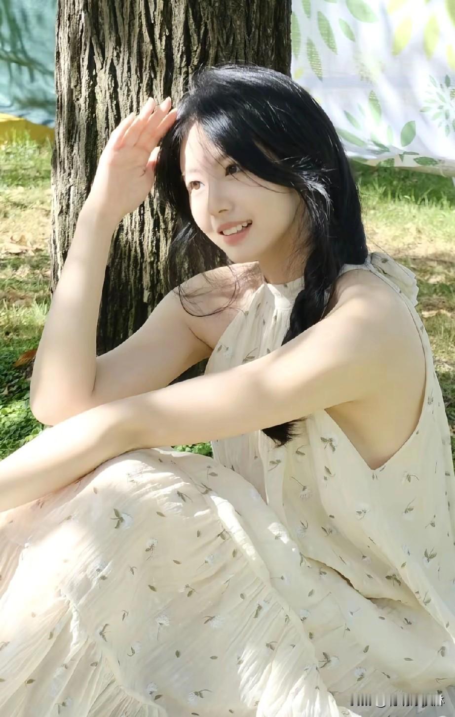 阳光洒落,树影婆娑,少女轻倚树干,笑靥如花。