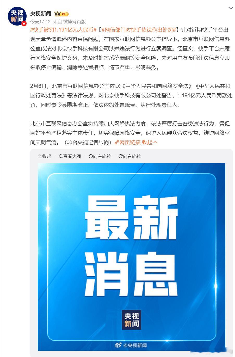 给出结果了快手被罚1.191亿元人民币