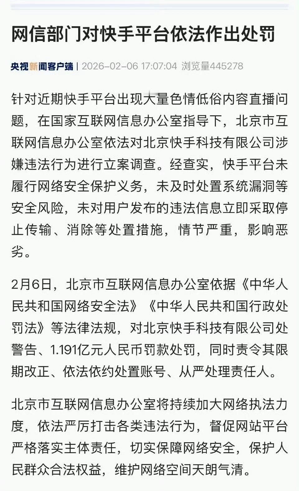 快手被罚1.191亿元人民币快手平台因色情低俗内容直播问题,处罚1.19亿元人民