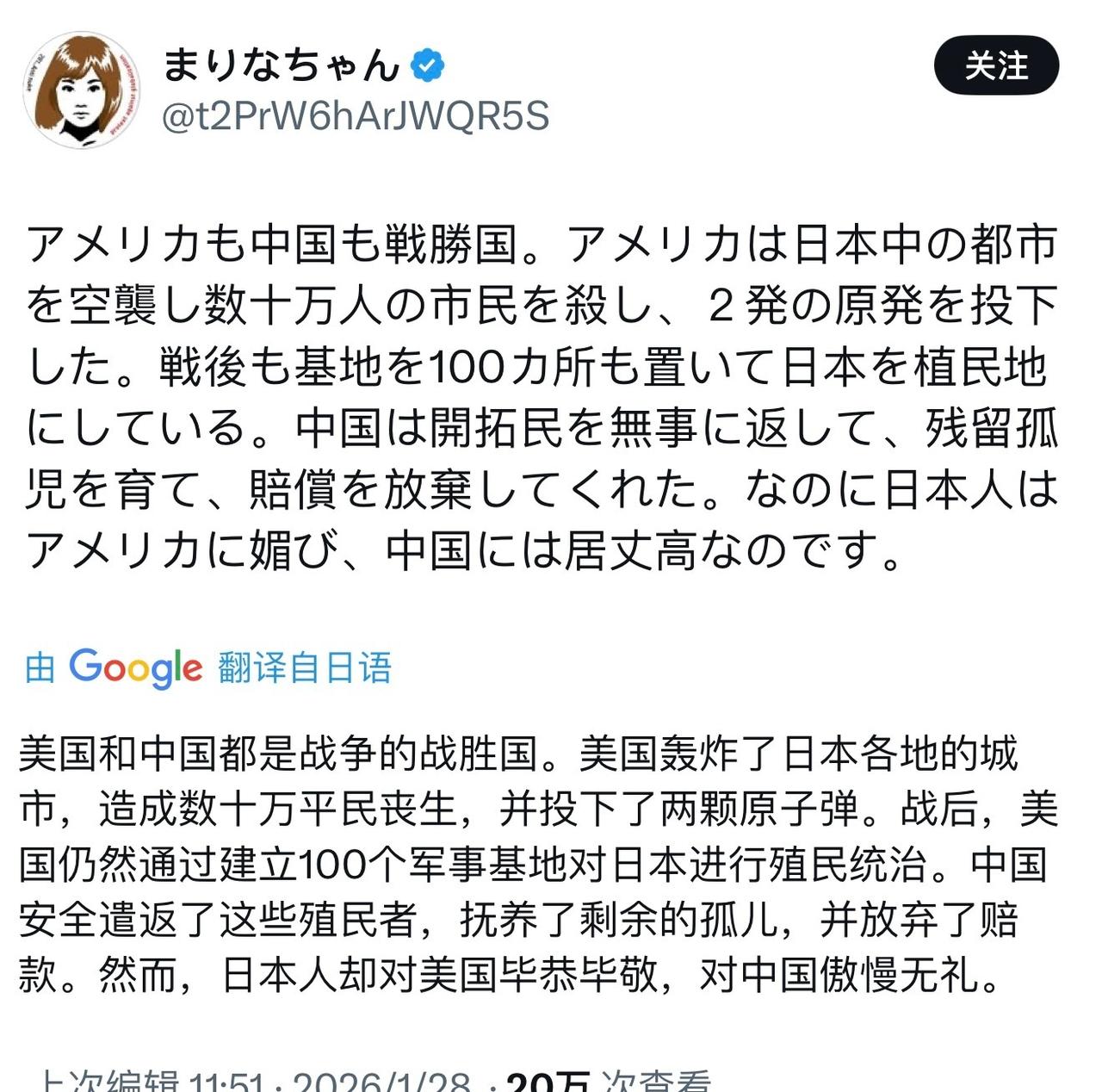 日本女孩的疑问: 美国和中国都是战争的战胜国。美国轰炸了日本各地的城市,造成数十万平民丧生,并投下了两颗原子弹。战后,美国仍然通过建立100个军事基地对日本进行殖民统治。中国安全遣返了这些殖民者,抚养了剩余的孤儿,并放弃了赔款。然而,日本人却对美国毕恭毕敬,对中国傲慢无礼。