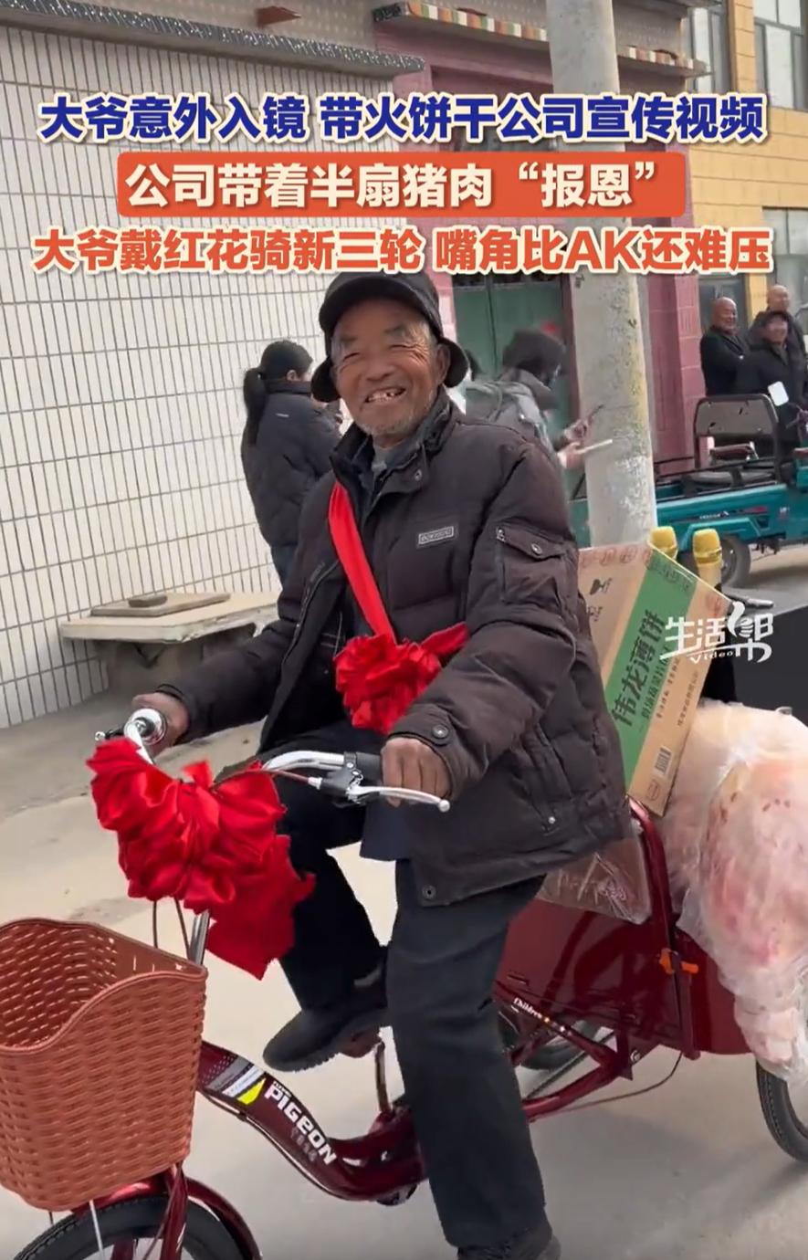 格局打开了!山东济宁,一家饼干公司请男团帮忙拍摄宣传视频,没想到,跳舞跳到一半时,一位大爷突然骑着三轮车从镜头中穿过,厂家不但没有生气,反而弄了半扇猪肉奖励给大爷,大爷带着大红花,拿到猪肉的那一刻,嘴角比AK都难压 当时,几名男团在厂家门口一边拿着公司的饼干一边眺“大花轿”,谁知跳的正来劲,一名骑着三轮车的大爷没有避让,直接从镜头里穿了过去,如此意外的举动,也是让男团成员们一下忘了动作,全都停在了原地 这要是放一般公司,可能得喊停重拍,心里还得埋怨大爷碍事。可这家厂子没这么想。视频发出去之后,大爷那淡定穿越的镜头,反而成了点睛之笔,网友们乐坏了,都说这是“神来之笔”“现实版乱入”,视频热度一下就上去了 厂家一看,这流量是大爷带来的啊,得找着他。没过几天,真联系上大爷所在的村子了。他们没搞虚的,直接拉去了实实在在的谢礼:半扇油亮亮的猪肉,一整三轮车的啤酒,寓意“有肉有酒,越过越有”。给大爷戴上了大红花,大爷抱着那半扇猪肉,脸上的笑藏都藏不住,实实在在的高兴 事情还没完。厂里又拉来一皮卡车的自家饼干,给村里60岁以上的老人挨家挨户分。村里一下子像过节,老人们拿着饼干笑呵呵 要我说,这事儿有意思的地方就在这儿。它不像个策划好的营销,反倒像一场生活即兴给所有人出的题。男团跳舞是安排好的“戏”,大爷的三轮车是真实的“生活”。大多数时候,我们总想着让生活给戏让路,觉得意外都是麻烦。但这回,厂家接住了生活抛过来的梗 他们看到的不是搅局,是缘分;想到的不是损失,是回馈。这一下,格局就不同了。没有去教训大爷“怎么不看路”,也没有简单给点钱打发,而是用了最朴实也最有分量的方式——猪肉、啤酒、饼干,都是过日子用得着的东西,还惠及乡邻。这谢意,实在,也体面 它让人看到一种久违的、很有人情味的处事方式:不较真于计划的完美,而是珍惜不期而遇的趣味;得了好处不独享,懂得把一份欢喜变成一群人的温暖。这种实在和厚道,本身就是一块金字招牌