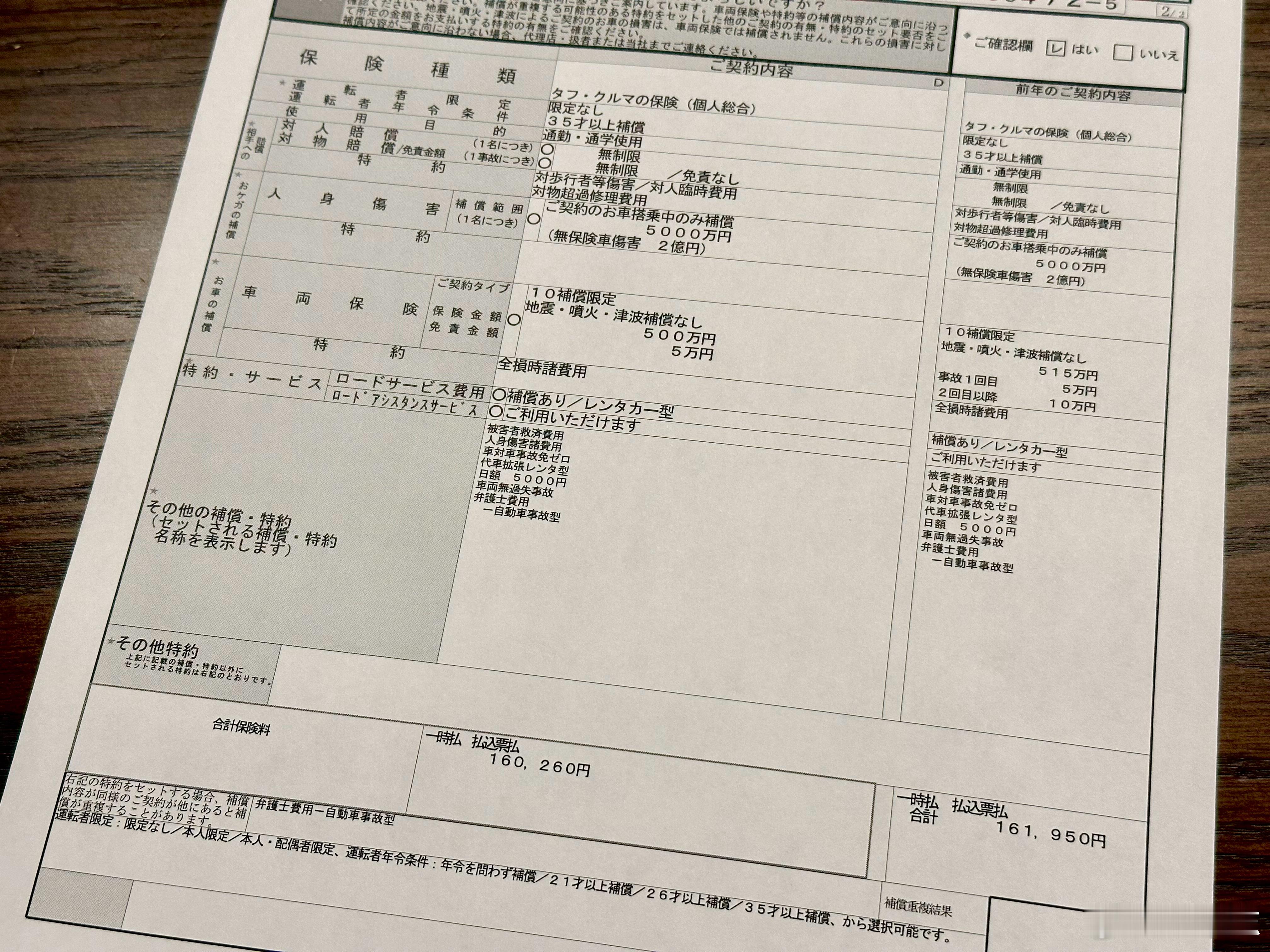 法子又该续车险了。车损500万,第三者对人对物无上限,车上人身伤害每人5000万。每年保费16万日元(7000多人民币),算贵吗?