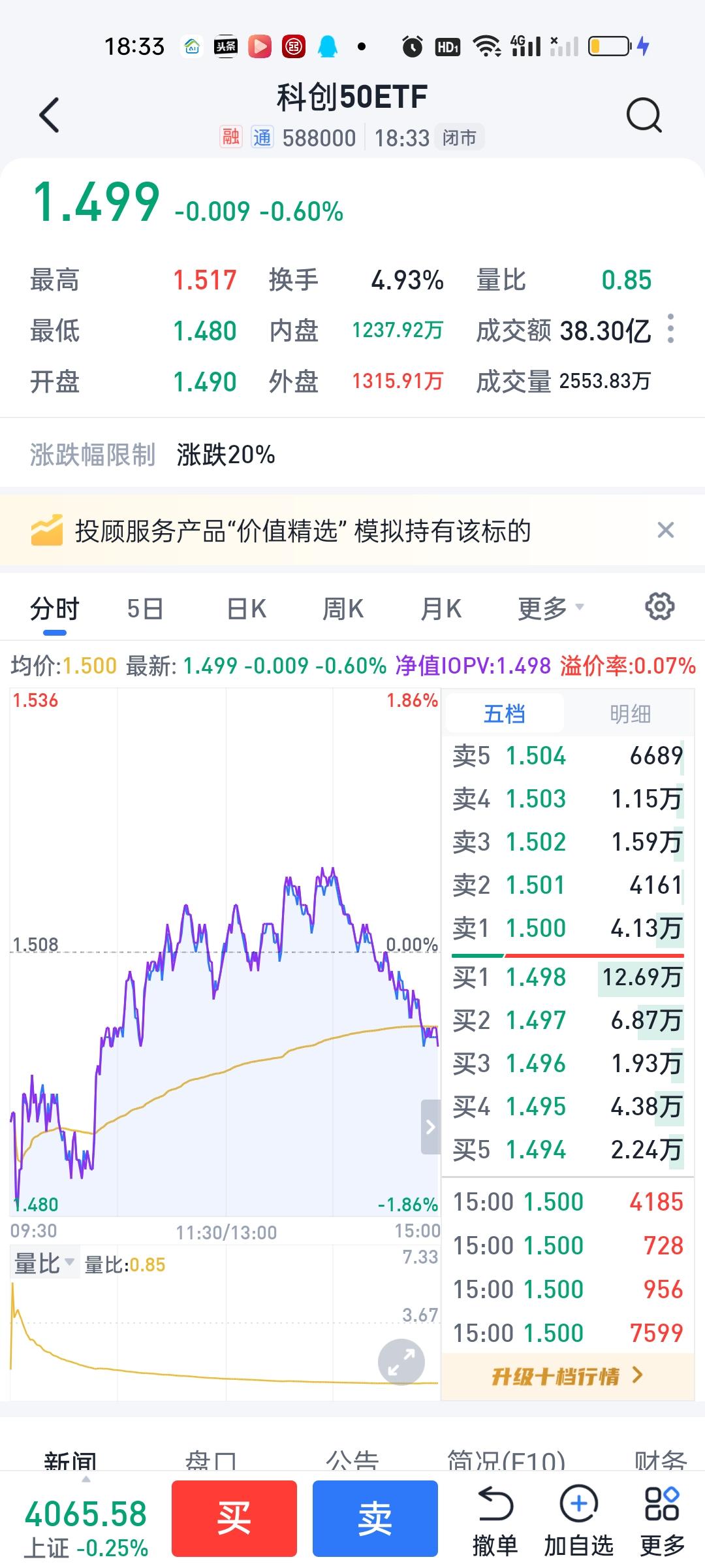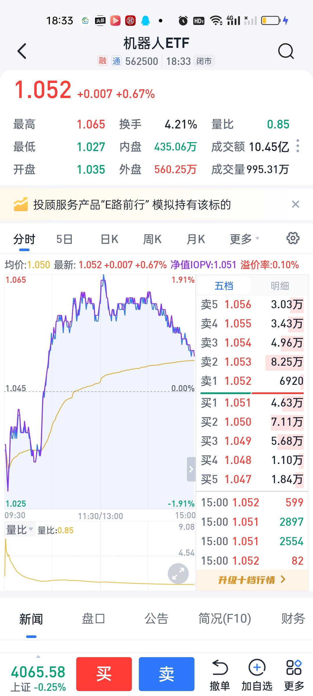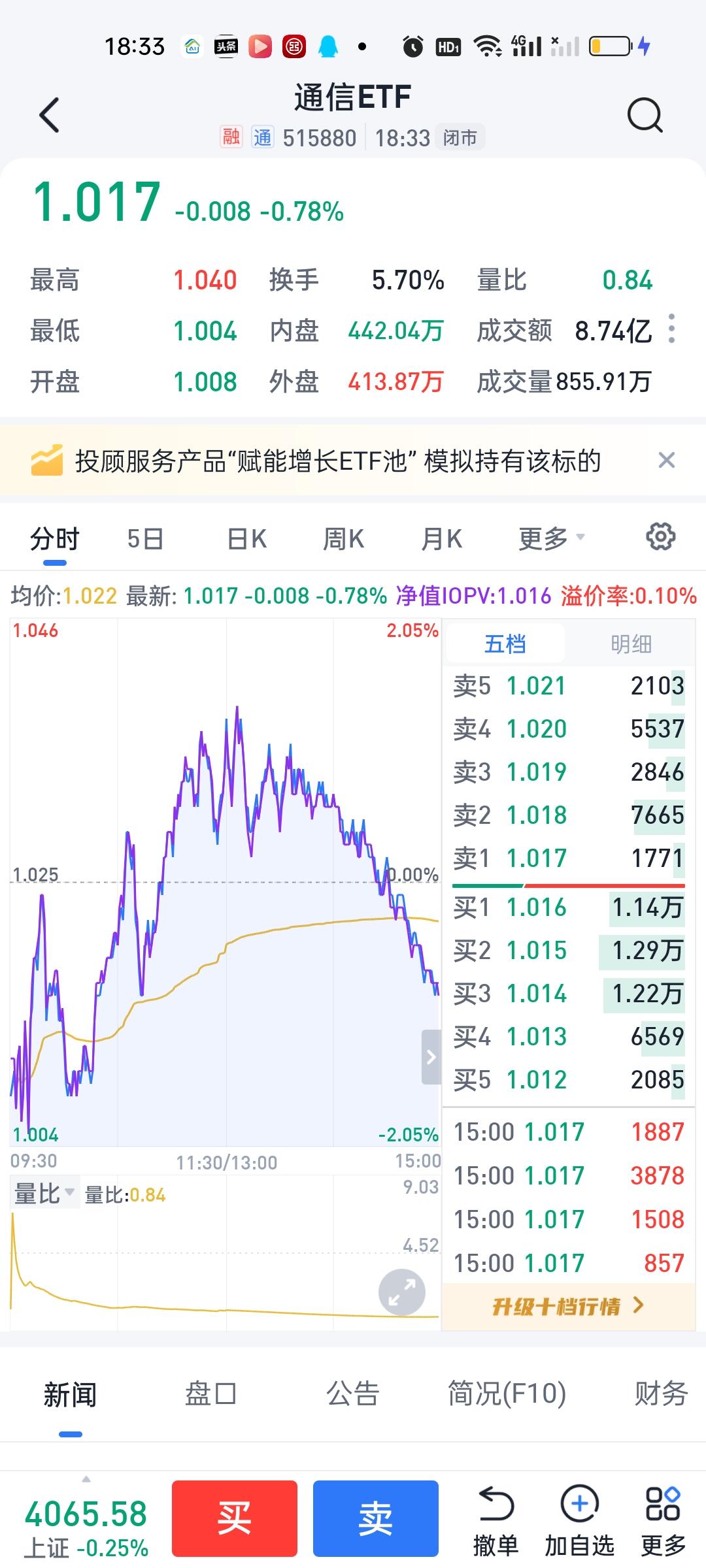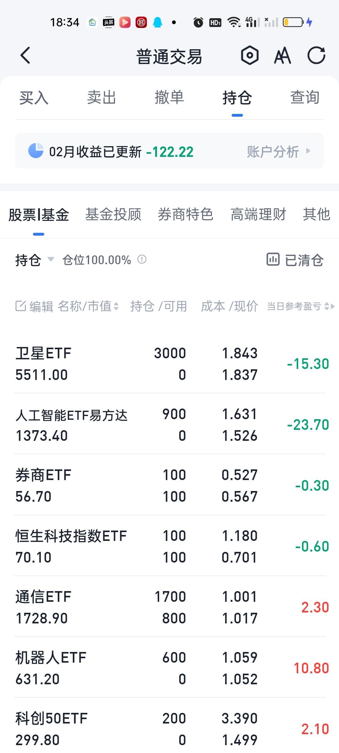 今天场内证券亏了20多元,本来在高点的时候还盈利100的,小亏就小亏吧,其实也无伤大雅的。每个月小米➕步枪挣个千八百也能接受了。 卫星ETF走了一个M型,也就是说给了3次低位买进机会2次高位卖出机会。我尾盘又接了800股回来,目前合计3000股,其它几个板块走势基本都差不多,都是冲高回落,尾盘回落。与大盘走势基本一致,场外基金目前的盈亏暂时说不好。等开出来才知道。
