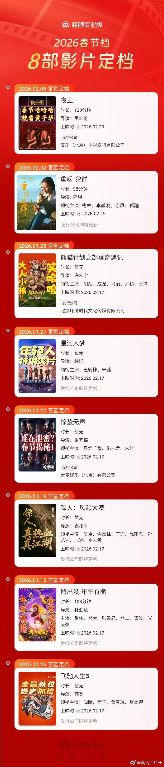 8部影片定档2026春节档分别为《飞驰人生3》《惊蛰无声》《镖人:风起大漠》《熊出没·年年有熊》《星河入梦》《熊猫计划之部落奇遇记》《重返·狼群》 《夜王》 哪部电影是你们最想看的?