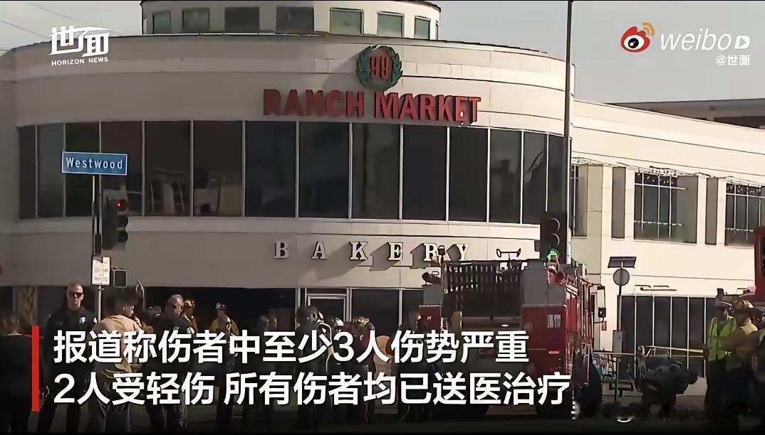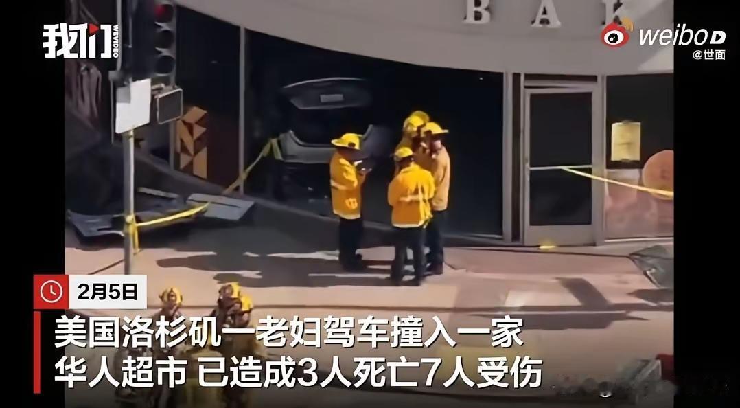 2月5号美国洛杉矶市一个92岁老太太驾驶汽车冲入华人连锁超市,撞死超市里面的2个员工和一名顾客,老太太在超市门口与一辆车相撞后又撞到了一个骑车人,然后就失控冲进超市,当场死亡3人7人受伤住院,这个超市是99华人超市连锁超市,当地华人经常到这里购物。