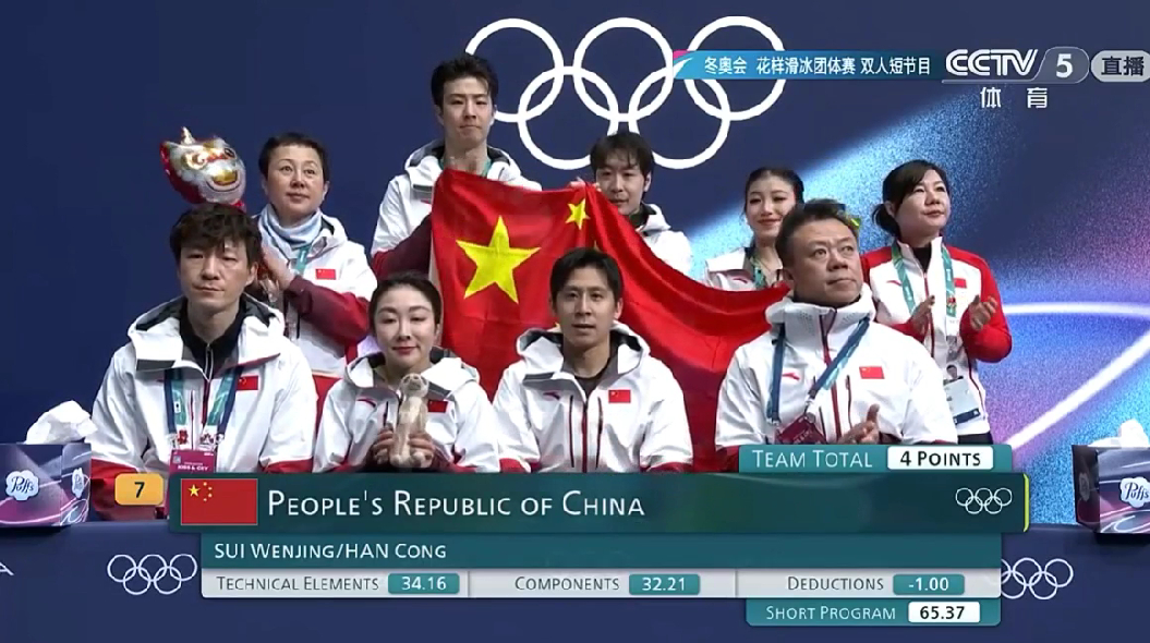 隋文静这下摔得好痛的感觉健康比完就行好好调整 隋文静韩聪短节目得分: 34.16+32.21-1=65.37