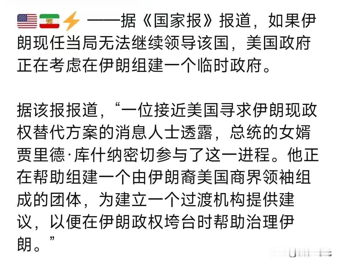 重磅消息:如果伊朗现任当局无法继续领导该国,美国政府正在考虑在伊朗组建一个临时政府。 据该报报道,“一位接近美国寻求伊朗现政权替代方案的消息人士透露,总统的女婿贾里德·库什纳密切参与了这一进程。 他正在帮助组建一个由伊朗裔美国商界领袖组成的团体,为建立一个过渡机构提供建议,以便在伊朗政权垮台时帮助治理伊朗。 ”——据《国家报》报道 据《华尔街日报》报道,哈梅内伊对停止铀浓缩活动几乎没有做出妥协的意愿,并警告称,美国的攻击可能会引发地区战争。伊朗