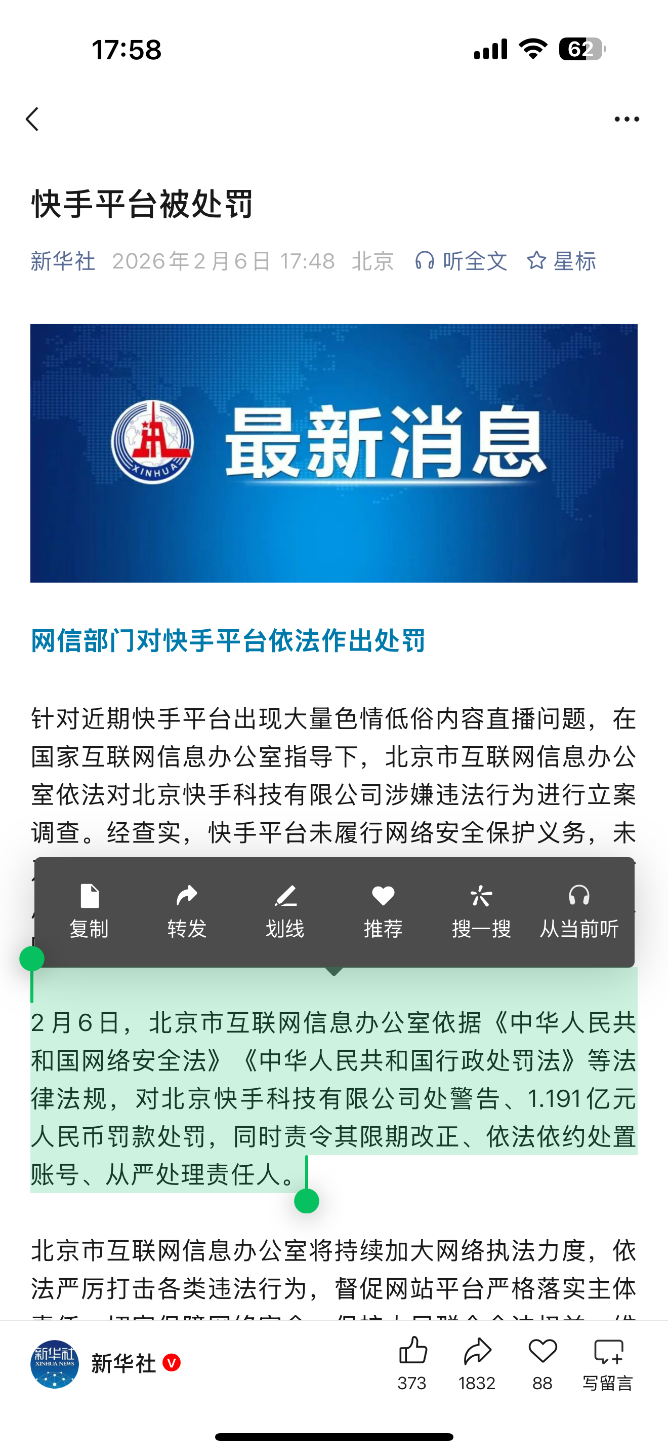 快手被罚1.191亿元人民币一个小目标,其实很合理,平台责任。