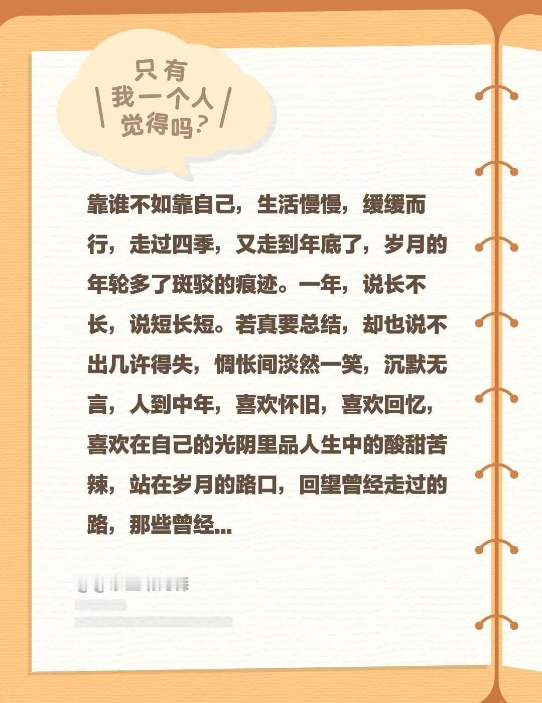 我评论了@@余生纳先森 的作品:靠谁不如靠自己,生活慢慢,缓缓而行,走过四季,又走到年底了,岁月的年轮多了斑驳的痕迹。一年,说长不长,说短长短。若真要总结,却也说不出几许得失,惆怅间淡然一笑,沉默无言,人到中年,喜欢怀旧,喜欢回忆,喜欢在自己的光阴里品人生中的酸甜苦辣,站在岁月的路口,回望曾经走过的路,那些曾经的迷茫与徘徊,犹如过眼云烟,令人感慨和回味。生命的旅程里,有幸福,也有痛苦;有欢笑,也有泪水;有坦途,也有坎坷;有机遇,也有挑战。生活就是一根普通的绳子,将我们栓在不同的现实和责任之中,使我们不得不被岁月蹉跎了梦想,被时间绊住了脚步,被柴米磨平了棱角,被琐碎扰乱了初心,其实生活早已没有了期待,支撑我坚持的无非就是责任,心累到一定的程度,真的连计较和生气的力气都没有了,每个年龄段都有每个年龄段的压力,希望我们都能顶住生活的压力,好好生活下去,比上不足,比下有余,记住了,永远不要和别人比生活有多少钱我们就过多少钱的日子,不要羡慕,不要攀比,不要嫉妒,更不要去强求,繁花似锦只是生活的点缀,平淡知足才是生命的底色,圈子不同,追求不同,各有活法,开心了就笑,累了就休息,日子图的是安稳和踏实,平安健康才是我们最大的幸福
