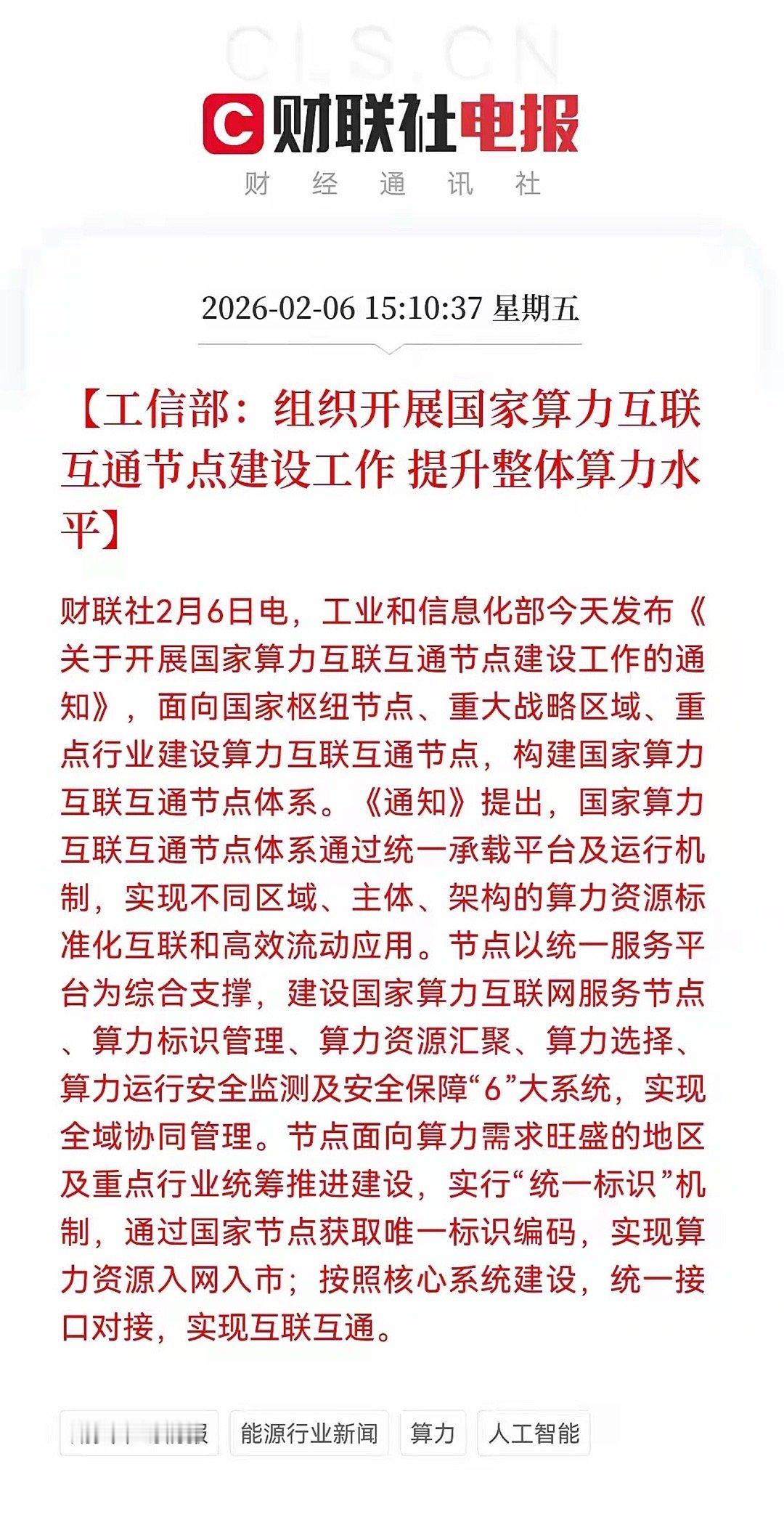 利好!重大利好!算力迎来重大利好!工信部算力互联互通节点建设启动,全产业链投资机会解析。2026年2月6日,工信部正式发布《关于开展国家算力互联互通节点建设工作的通知》,标志着我国算力网络建设进入标准化、互联互通的全新阶段。这一政策将直接驱动算力基础设施的升级与重构,为资本市场带来清晰的投资脉络。一、政策核心价值:算力资源的“高速公路”国家算力互联互通节点体系的建设,本质是为东数西算等工程建立“统一操作系统”。它通过构建统一承载平台、服务平台和六大核心系统,解决了不同区域、不同主体间算力资源的孤岛问题,实现了算力的标准化接入、高效调度和安全可信流通。这一国家级工程的推进,将从“硬件基建”、“网络传输”到“平台软件”、“安全服务”全链条产生持续的资本开支需求。二、全产业链投资标的全景图(一)算力基础设施层:硬件底座先行1. 服务器与GPU: