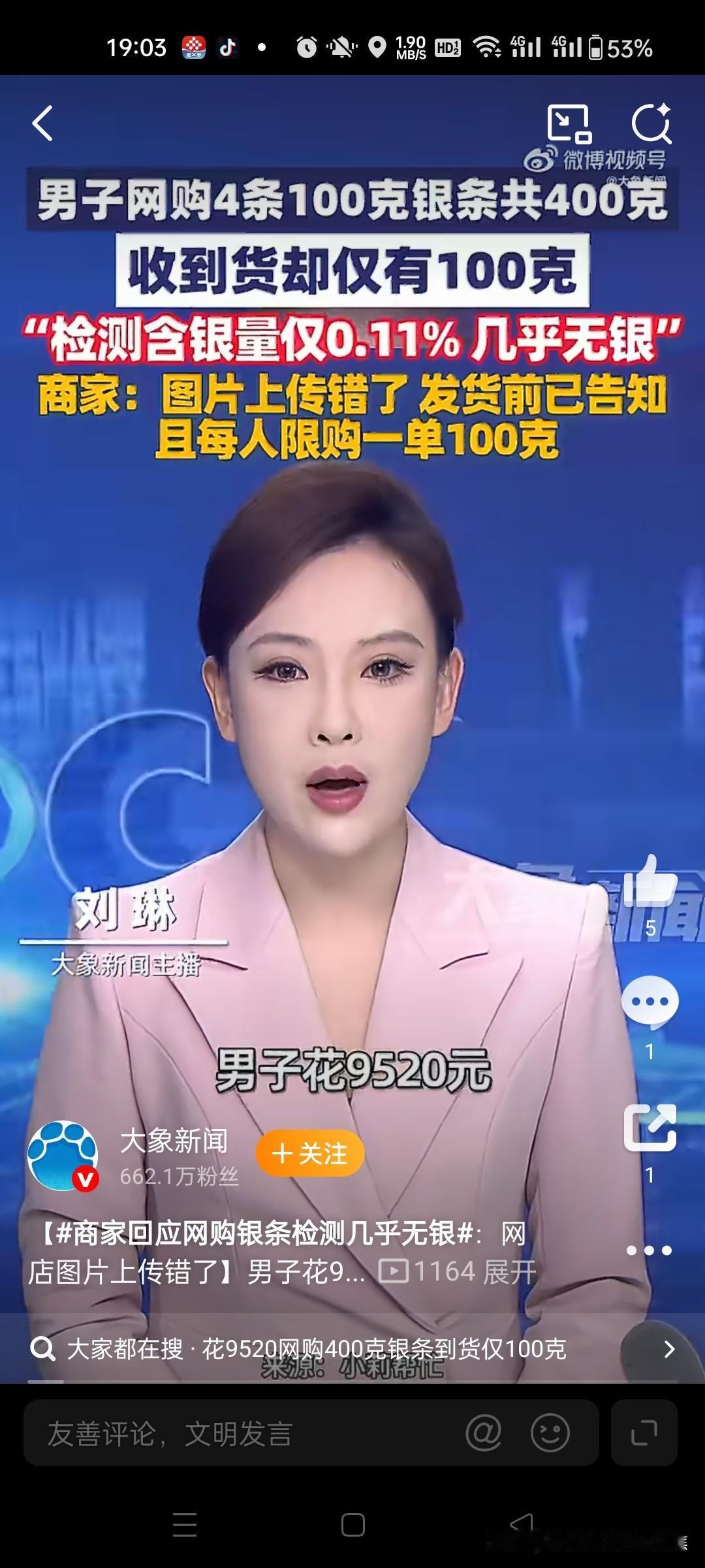 网购来的银条含银量低至0.11%, 河南郑州一男子花费9520元网购400克投资银条,实际仅收到100克货物,经专业检测含银量低至0.11%,商家辩称“商品图片上传错误”,但消费者否认事前获告知,涉事店铺已关闭跑路。 事件核心经过 欺诈事实明确 该男子购买的400克银条实际仅收到100克,通过光谱检测发现含银量仅为0.11%,几乎可视为无银制品(主要成分为锌、镍合金或黄铜)。按当日银价计算,实物价值不足支付金额的1%。@小莉帮忙14 商家推诿责任 商家回应称“网店图片上传错误”,并声称“发货前已告知客户”,但消费者表示未收到任何提示。平台介入后,涉事店铺迅速关闭,消费者面临追责无门的困境。@大象新闻227 同类骗局高发 假货泛滥:近期多起案例显示,网购白银存在严重造假,如广西消费者花1550元购“99.99%纯银条”,实测为62%铜+34%锌合金;直播间69.9元“100克足银”实为镀银锌合金。@我苏特稿1619 伪造凭证:商家常附虚假鉴定证书(网上1元可定制),利用密封包装阻碍验货。@九派新闻23 低价陷阱:标价远低于国际银价(如12元/克成本的商品售0.7元/克),以“冲销量”“福利价”诱导下单。@静静爱生活吖...16小莉帮忙大象新闻tokuneco我苏特稿九派新闻红网北京时间静静爱生活吖A 行业乱象与风险 造假手段升级 技术隐蔽:假银条采用“包银”工艺(铜芯镀薄银层),普通检测难以识别,需破坏性测试或专业光谱仪。@北京时间11 话术误导:直播间主播强调“足银999”“假一赔十”,商品页却用小字标注“银工艺制品”。1646 维权难度极高 商家采用“打一枪换一地”模式:投诉后迅速注销店铺,换名重新运营。@红网29 平台赔付有限:多数案例仅支持退款,赔偿上限不足实际损失10%(如假一赔十难执行)。@封面新闻 投资风险加剧 价格波动套利:部分商家借白银暴涨(2026年1月涨幅超60%)拖延发货,待银价回落再履约或强迫消费者取消订单。@红星新闻1541 实物交割陷阱:实体店银条需“整公斤起购”,且部分囤货商拒售现货,加剧流动性风险。@都市频道18许泽玮说封面新闻红星新闻梨视频都市频道 消费者防护指南 选购渠道 优先选择银行、品牌金店实体渠道;线上认准官方旗舰店或认证商户,核查企业经营资质。435 警惕“白菜价”商品:单价低于当日银价80%即存疑(如2月银价约25元/克)。1846 验货与证据留存 收货后立即复检:通过专业机构检测纯度,保留交易记录、开箱视频。124 验证证书真伪:查询鉴定机构官网或扫码溯源,确认CMA/CNAS资质。2912 维权路径 向平台投诉并申请信息披露,用于民事诉讼。10 涉案金额超5000元可报警立案(涉嫌诈骗罪)。28 集体投诉:通过黑猫平台或12315联动举报,推动监管部门溯源打击。29 ⚠️ 风险提示:贵金属投资需谨慎,非专业投资者建议通过ETF等金融产品间接参与,避免实物交割风险。直播间购物留存录屏证据,防商家话术欺诈。336多米鱼贝贝陈陈陈陈陈梦想