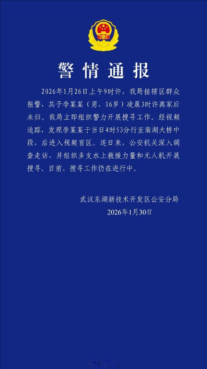 【武汉警方通报“16岁男生凌晨3时许离家后未归”:搜寻工作仍在进行中】武汉市东湖新技术开发区公安分局官方微博发布警情通报 :