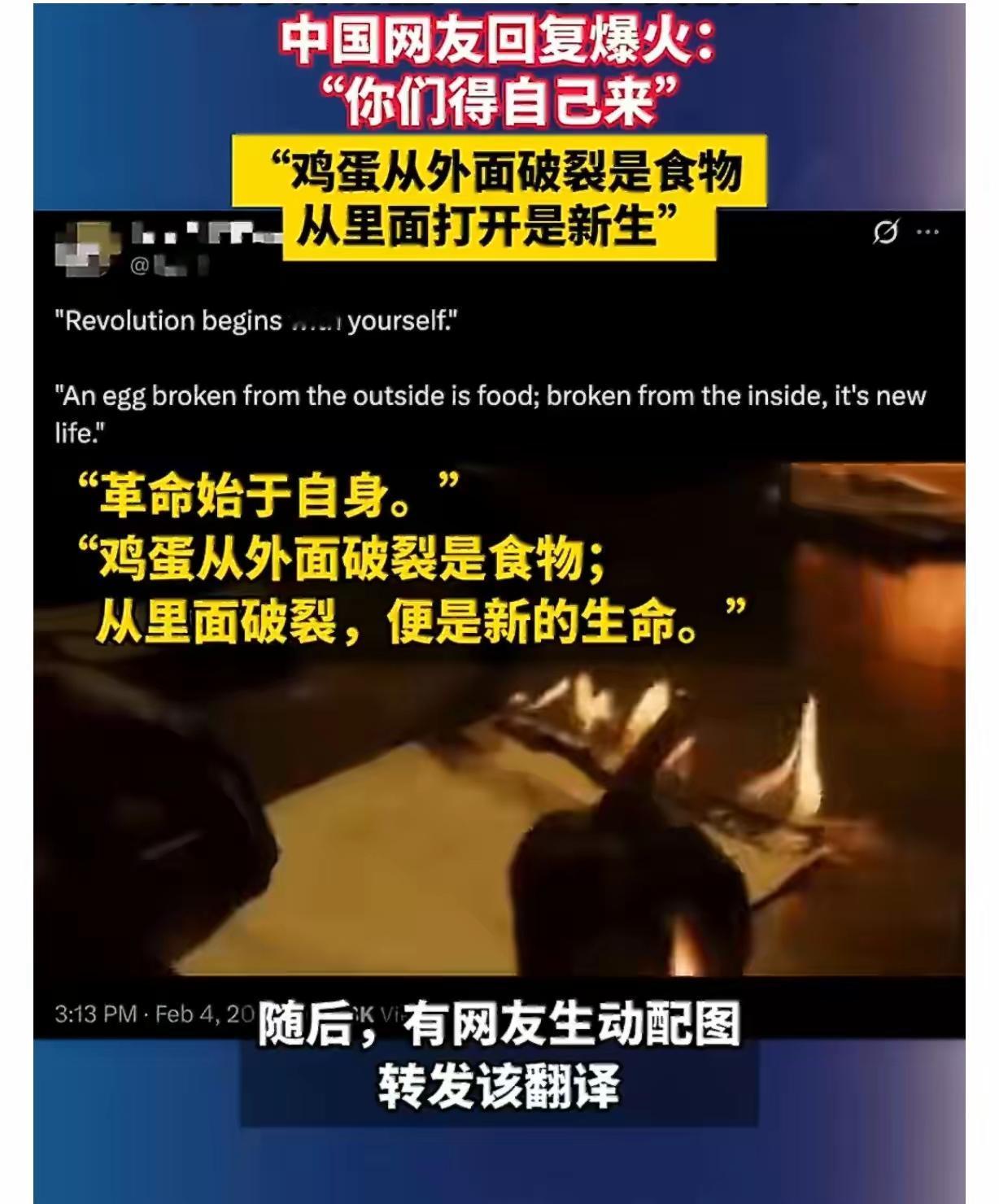 家人们刷到没?外国网友在网上发帖急着喊“帮帮我们,中国”,本以为会是清一色安慰,结果中国网友一句话直接封神! “你们得自己来”“鸡蛋从外面破裂是食物,从里面打开是新生”,就这一句,外国网友都看懵了,接着疯狂刷屏夸绝。可不是嘛!咱中国人讲道理就这么实在,不用大道理,拿日常吃的鸡蛋打比方,既不摆架子,又把“自己才是破局关键”说透了。 这话真不是咱中国人故意摆谱,实在是咱打小就明白的理儿。你想啊,谁家过日子没遇着过坎儿?小时候摔疼了哭着找爸妈,爸妈顶多给你吹吹伤口,还得让你自己爬起来;上学那会作业写不出来,老师也不会直接给答案,得让你自己琢磨思路。咱中国人的日子,就是这么一步步靠自己蹚出来的,没有谁能一辈子依赖别人。 外国网友可能一时没转过弯,觉得咱没顺着他们的话说安慰的话,其实咱这才是真心为他们好。你瞅瞅那些靠别人帮忙解决的事儿,哪回不是治标不治本?就跟种地似的,别人给你浇一次水施一次肥,能管得了一时,可要是自己不会打理,庄稼照样得旱死涝死。只有自己学会耕地、浇水、除虫,才能年年有收成,这道理放哪儿都一样。 再说了,咱中国人说话办事向来直来直去,不玩虚的。那些花里胡哨的安慰话,听着舒服,解决不了实际问题有啥用?还不如实打实点透关键,让他们自己琢磨明白。你看网友用鸡蛋打比方多形象,天天吃的东西,谁都能听懂,既不显得咱高高在上,又把核心意思说到位了。 外国网友后来疯狂夸绝,也是慢慢想通了这层意思。没人能一直当你的靠山,真正能救你的只有你自己。遇到事儿就想着找别人帮忙,那是把希望寄托在别人身上,万一别人帮不上忙,自己不就傻眼了?咱中国人讲究的是求人不如求己,与其等着别人伸手,不如自己攥紧拳头使劲儿,哪怕过程难点儿,最后闯出来的才是属于自己的路。 生活里的事儿都是这个理儿,不管是个人过日子,还是一个国家发展,都得靠自己硬气。别人能给你指个方向,能给你搭把手,但没法替你走完全程。就像那个鸡蛋,外面敲开了只能被人吃,自己啄破壳才能活下来,还能长成大鸡继续下蛋。咱中国人就是凭着这股自己闯的劲儿,从过去的难日子里一步步走出来,才有了现在的好日子。 各位读者你们怎么看?欢迎在评论区讨论。