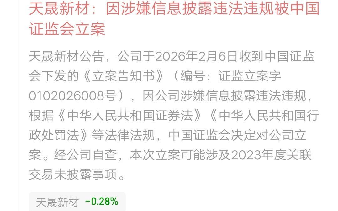 4.64万股民踩雷,现在估计想死的心都有了!两只股票被立案调查,一只科创板的,一只创业板的。 亚辉龙:因涉嫌信息披露违法违规,公司被立案调查。(误导性陈述) 1月6号,亚辉龙公告,与脑机星链签署合作框架协议。脑机星链成立于2025年9月2日,而且办公地址和亚辉龙一样。蹭概念炒作的意图,再明显不过了。被立案调查,一点都不冤。目前有1.28万股民。 天晟新材:因涉嫌信息披露违法违规被立案调查。 公司回应,经自查可能涉及2023年度关联交易未披露事项。目前有3.36万股民。 立案调查是很严重的利空,大跌是跑不掉的了。只是可怜了散户,默默的承担,眼泪往肚里咽。