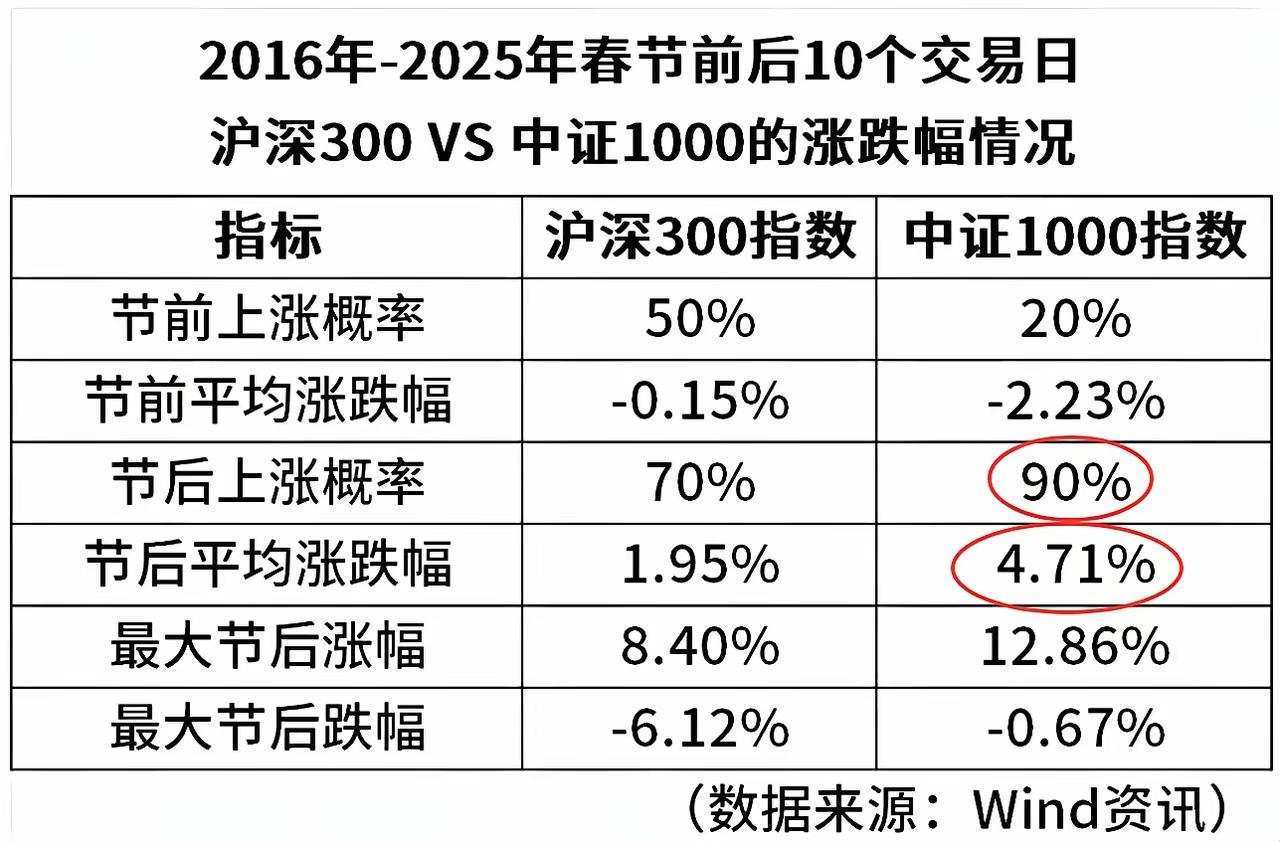 春节前这波跌,其实是给机会。 老股民都懂这个规律:节前市场往往有点“蔫”,节后反倒容易“醒”过来。看看数据更明白,2016到2025这十年,中证1000指数节前上涨概率才20%,平均跌2.2%;可节后10个交易日,平均涨4.7%,上涨概率高达90%。沪深300也有这规律,只是中证1000的“春节效应”更猛。 这周市场跌得让人有点慌,但仔细想想,这不就是规律里的“正常操作”?聪明钱早就行动了——周三到周五,南向资金连续三天大笔加仓,133亿、250亿、148亿,一串数字摆在那,明摆着是趁着港股杀跌捡便宜。他们懂,利空没消化完的时候动手,才能拿到性价比高的筹码。 普通人总容易反着来:节前跌的时候怕被套,不敢买;节后涨起来了又追着进,结果刚好踩在高点。就像买菜,节前菜价往下走,总觉得“还能再降”,等节后涨价了又急着囤,其实最划算的买入时机,往往就在节前那波调整里。 当然,建仓不是瞎买。得挑那些有业绩支撑、估值合理的票,别去碰那些炒概念的“妖股”。南向资金加仓的方向里,不少是高股息的蓝筹、有成长潜力的科技股,这些才是能扛住波动、等得到节后行情的硬通货。 现在的下跌,不是风险,是机会的“折扣期”。就像商场节前清库存,看着乱,其实藏着不少好东西。与其天天盯着K线慌神,不如沉下心挑几只靠谱的,趁着调整慢慢建仓。等春节过后,市场回暖,这些低位筹码才能真正派上用场。 记住,春节行情的剧本,近十年都写得差不多了:节前跌一跌,节后涨一波。看懂这个规律,就别被短期波动吓住。现在动手,不是赌,是跟着大概率事件走——这才是普通投资者最该有的聪明。 带定位晒今日生活 我的今日状态:💰期待暴富 我这里的天气:🍂微风
