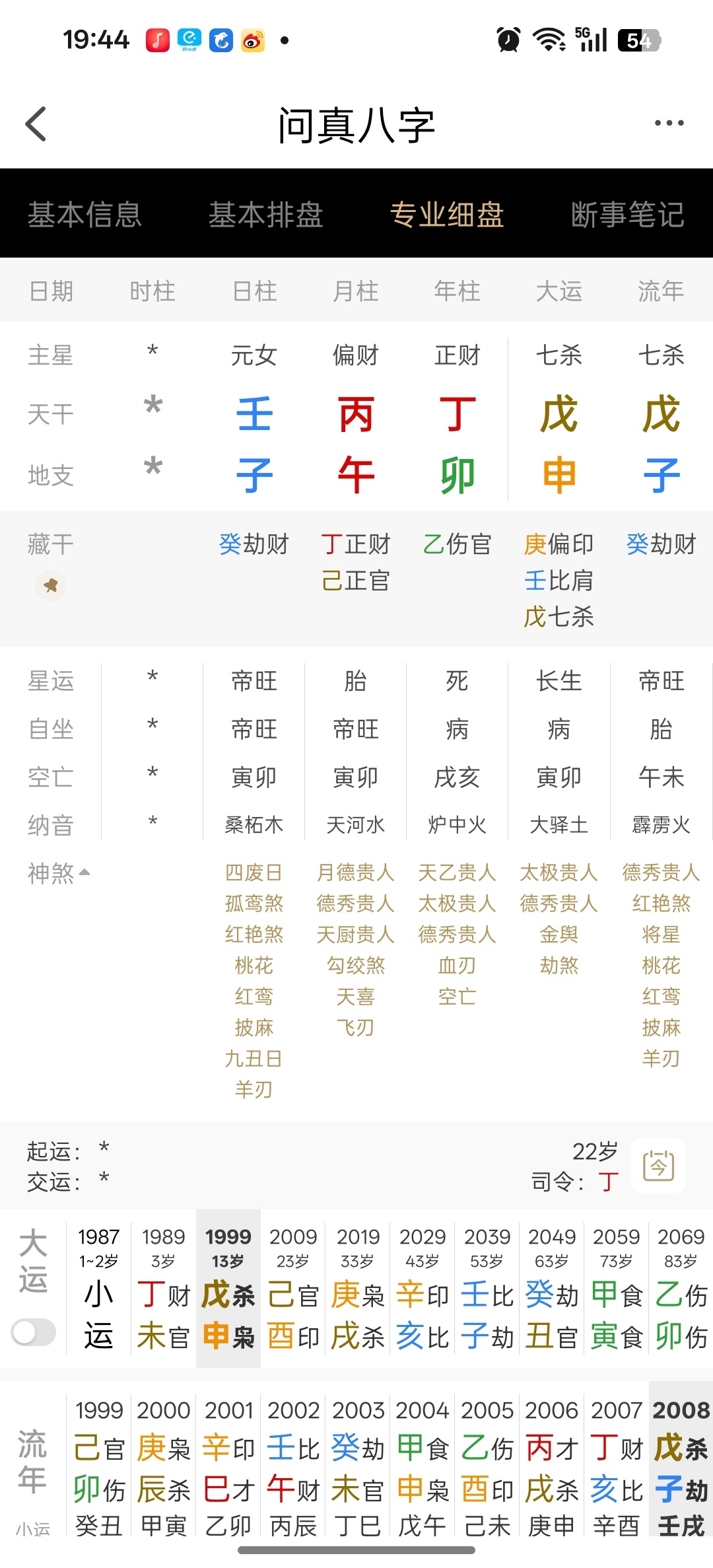 丁卯 丙午 壬子,天干透出丙火偏财和丁火正财,财星非常强旺。而日主壬水在地支只有子水一个根,还被午火冲克财攻身、财旺身弱。 没有印。像一叶孤舟,一艘小船在财欲的烈火中航行。