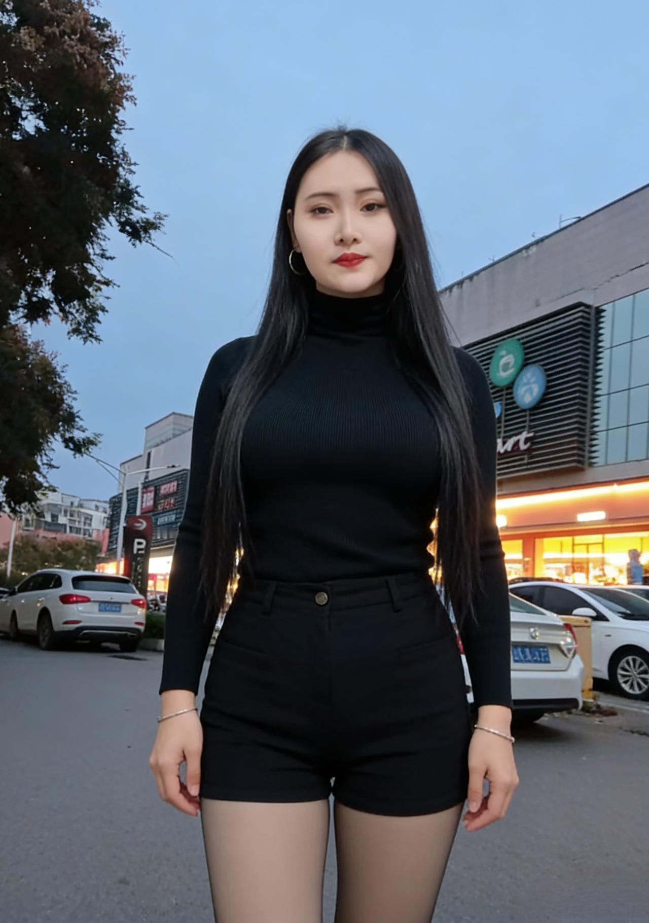 她站在路口,是城市的一个坐标 左边是树的浓荫,右边是商铺的灯潮 黑色的衣装,是融入城市的保护色 却又在人群之外,划出清晰的边界 高领收住了喉间的话,也收住了微凉的风 短裤让双腿成为视线的落点,坦荡又直接 长发是披散的思绪,垂到腰际 在车水马龙里,保持着独有的沉静 ~ 车牌的蓝,建筑的灰,树的深绿 都成了她背景里的色块 她的红唇,是这冷色调画面里的一点焰 烧穿了城市傍晚的平淡 指尖轻垂,没触碰任何俗世的物件 却像握住了,这片刻的街景与自我 城市在流动,她站成礁石 任车流人海,从身旁淌过