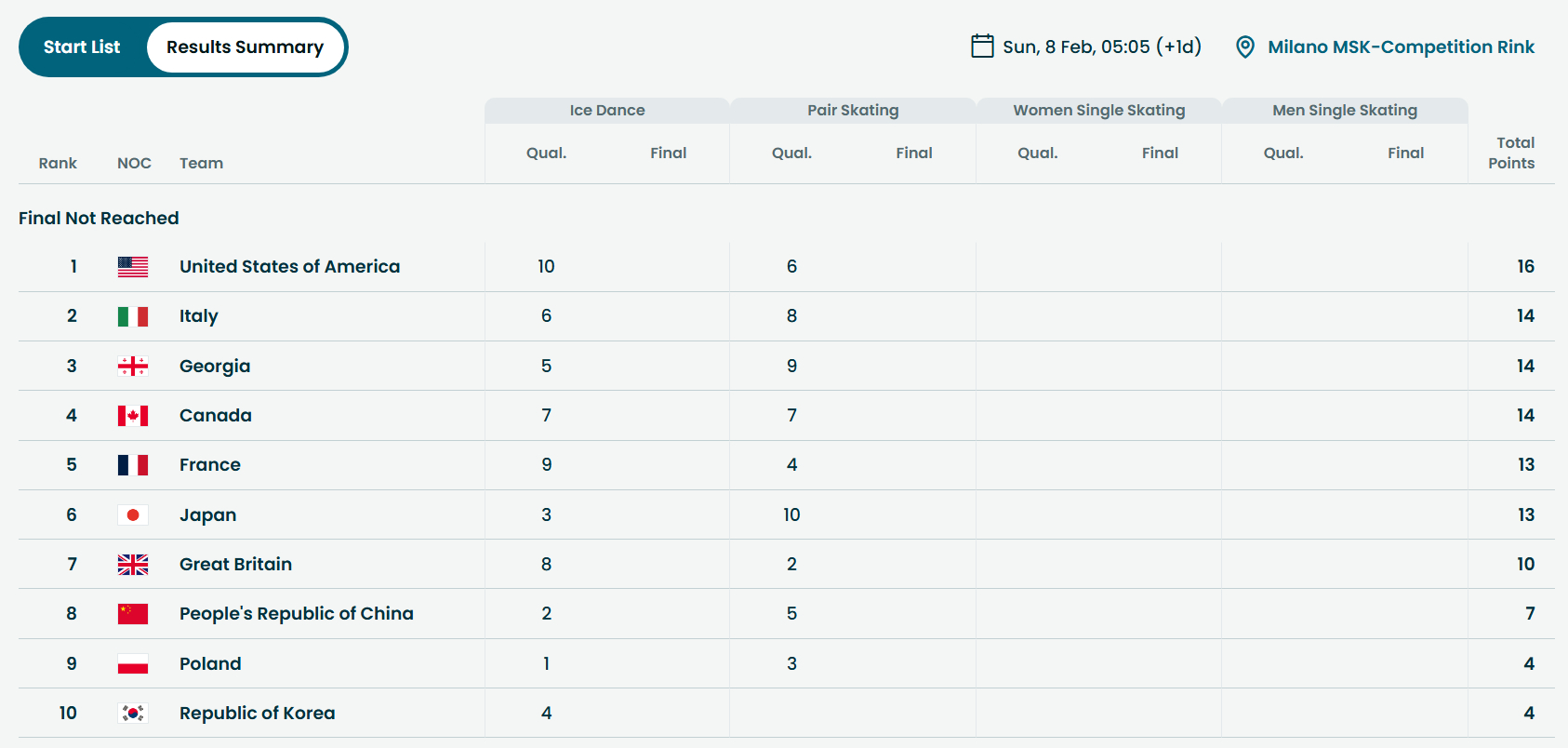 【奥运花滑】团体双人积分情况(双人SP),中国5分,日本10分,格鲁吉亚9分,意大利8分,加拿大7分,美国6分,法国4分,波兰3分,英国2分。总分如图二。
