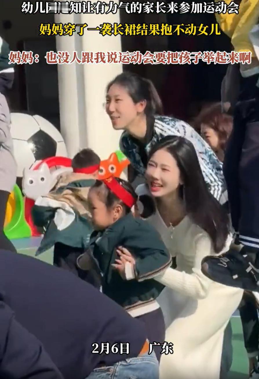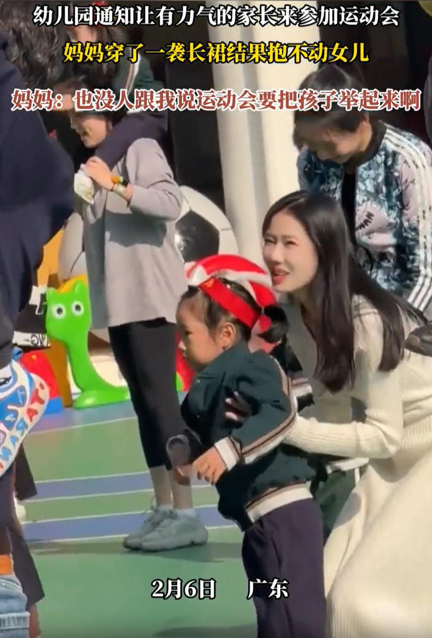太尴尬了!广东,一女子去参加女儿幼儿园举办的亲子运动会,来之前幼儿园说要家里力气大的家长来,女子压根没多想,可到了现场才知道要把孩子举起来,结果全场就只有她抱不起来,只能捂着嘴原地尬笑 孩子的妈妈称,在来参加运动会之前,幼儿园就通知要家里有力气的家长来参加运动会,可她想着,一个运动会还需要什么力气,穿着长裙和拖鞋就来了,结果在运动会上,通知家长把孩子举过头顶时她就懵了 其他的家长都能把孩子抱起来,现场一片欢声笑语,唯独这位妈妈,她试了好几次,脸都憋红了,孩子却纹丝不动,最后只能捂着嘴尴尬地笑。自家孩子脸上一点笑容都没有,场面确实有点难堪 有网友说:这一看就是在家不干活的主,平时连孩子都不咋抱 我觉得这倒是能理解,毕竟每个人和每个家庭情况都不同,有人平时工作忙,带孩子的主力是老人或爸爸,甚至请外人,妈妈力气小点也正常。但穿着长裙和拖鞋去运动会,确实显得对活动不够重视 亲子活动虽然是个轻松的场合,但也真得多留意下具体要求。有时候,穿着和场合的匹配会直接影响到你的表现,尤其像这种需要一点“力气”或者灵活度的运动会。如果是平时少做运动,身形也比较娇弱的家长,确实得提前做好准备,别到时候又尴尬又没面子 当然,幼儿园的通知也有值得商榷的地方。“要家里力气大的家长来”这种说法太模糊,如果明确告知有抱举孩子的环节,家长肯定会做准备。有些妈妈为了这次活动,可能特意换了运动装平底鞋,甚至提前在家练习过 毕竟亲子运动会的初衷是增进亲子感情,不是比赛谁力气大。如果因为这样的环节让孩子感到失落,反而违背了活动本意