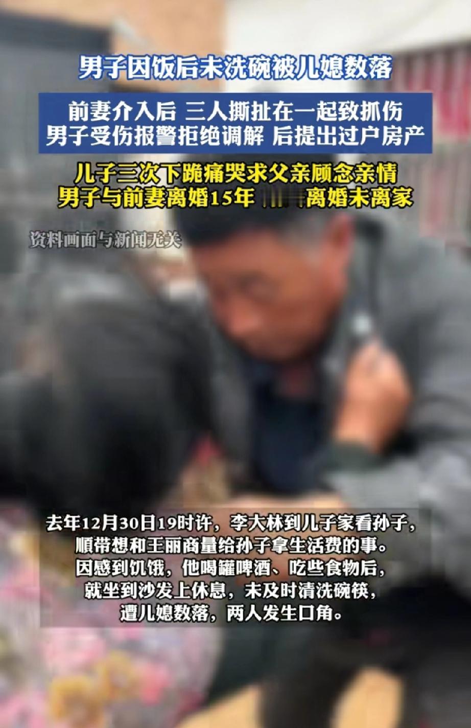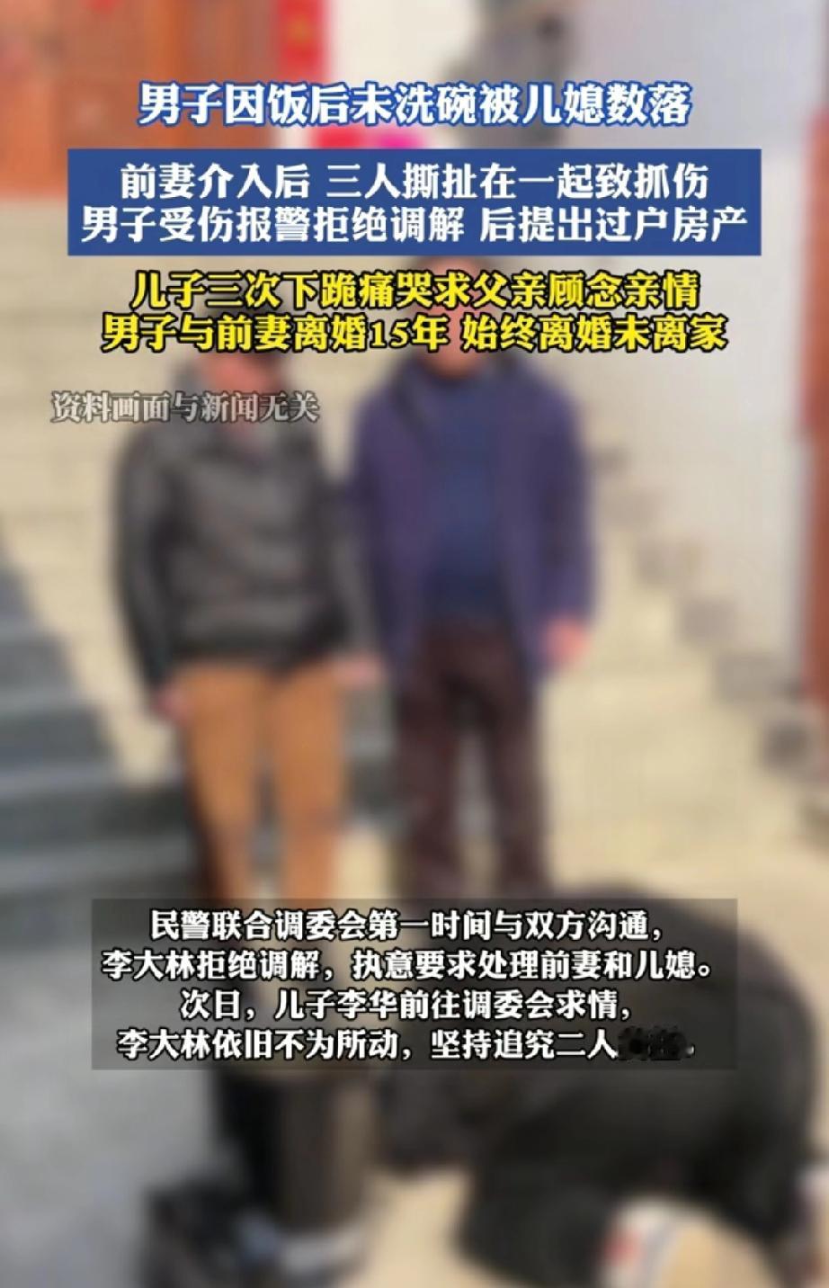 万万没有想到!黑龙江大庆,李某和前妻离婚15年却一直同住,只因饭后没及时洗碗,被前妻和儿媳抓伤,他怒而报警执意追责,儿子夹在中间左右为难,接连三次求情甚至下跪,最终李大林念及亲情选择原谅,这场家庭矛盾才终于收场。 这件事的根源,远不止于几个没洗的碗。李某与王某虽然离婚15年,却一直“离婚不离家”,这种模糊不清的关系早已埋下隐患。儿子成家后,王某去帮忙带孙子,李某也常去,家庭的边界更加混乱。 冲突在去年12月30日晚爆发。李某在儿子家吃完饭,坐在沙发上休息,没立刻洗碗。儿媳对此不满并出言数落,两人吵了起来。 在卧室的前妻王某闻声出来,非但没有劝和,反而加入指责,甚至上前拽住了李某的衣领,三人随即扭打在一起。受伤的李某感到“又疼又委屈又寒心”,坚决报警。 随后的调解一波三折。儿子小李多次替母亲和妻子求情,但李某不为所动。在第三次调解时,李某提出了一个令人意外的条件:要求儿子将名下两套房子中、由他出资的那套过户给自己。这个要求让儿子无法接受,调解陷入僵局。 转机出现在今年1月24日。在调解现场,儿子小李情绪崩溃,他哭着控诉父亲常年来的指责,也替家人道歉,随后三次向父亲下跪,恳求父亲顾念亲情。 看着泪流满面、跪在面前的儿子,李某沉默了许久,最终长叹一声,选择了原谅。 在我看来,离婚不离家本就埋雷!法律上已解除关系,生活中却仍纠缠不清,这种状态让所有人角色错位,怨气日积月累,几个碗只是压垮骆驼的最后一根稻草。 而 这场闹剧中,最痛苦、最无助的无疑是儿子李华。一边是父亲,一边是母亲和妻子,他被迫成为中间的“夹心饼”。最终那三跪,跪碎了多少为人子女的无奈与心酸,让无数有类似家庭经历的人感同身受。 李大林从坚决追究责任,到突然提出过户房产,让事情的性质发生了变化。这不禁让人怀疑,最初的受伤愤怒,是否后来演变成了利益的算计? 家还是讲情的地方。 尽管各有对错,家庭矛盾一旦闹到要对簿公堂、用法律武器互相针对的地步,亲情就已经出现了深深的裂痕。儿子那三跪,跪求的不是法律上的宽恕,是亲情本能的回归。