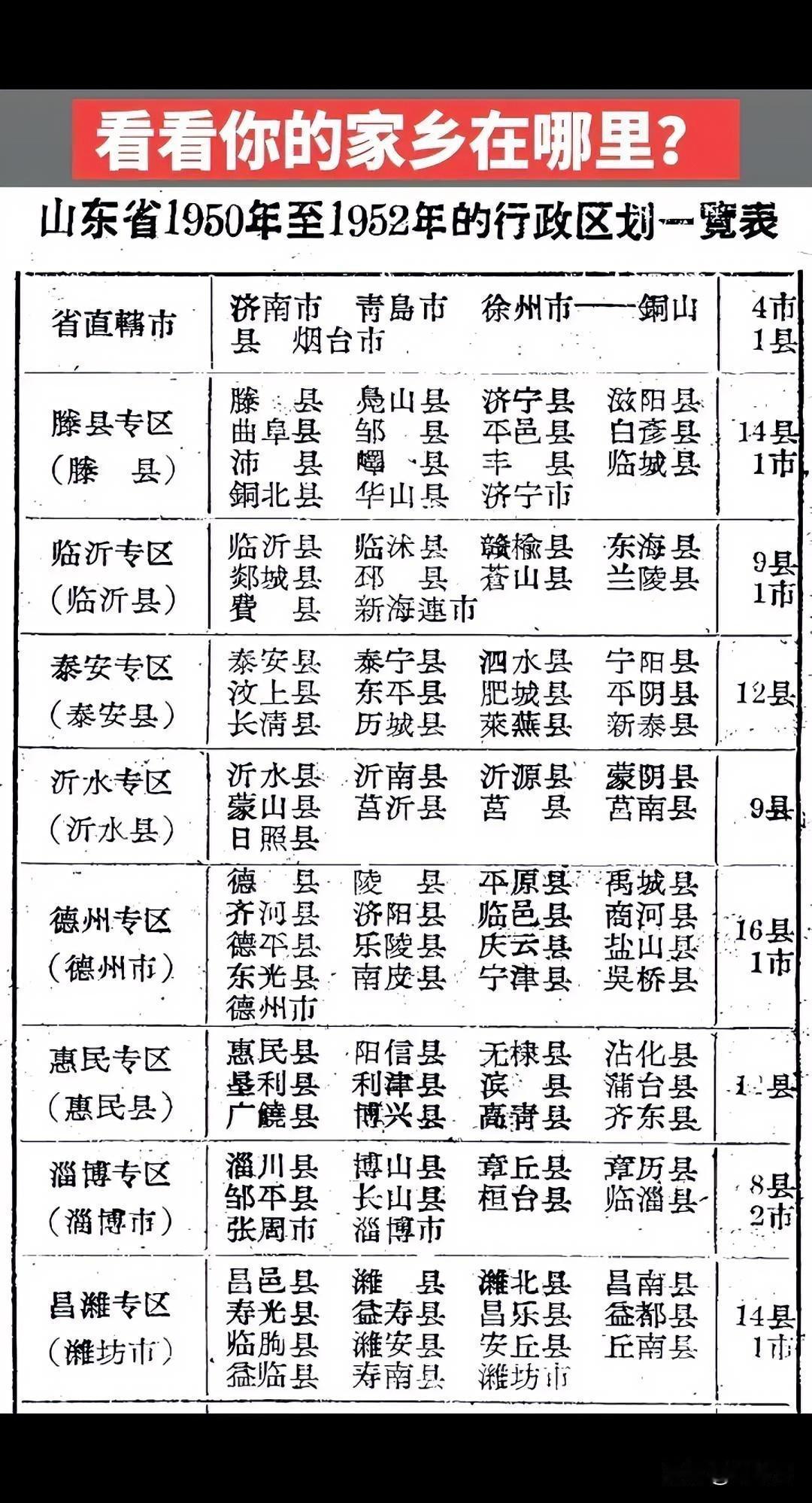 你老家在哪里?山东省各区县1950—1952年行政区划一览表揭秘!省辖市,济南市、青岛市、徐州市、烟台市!还是藤县。原来山东人除了青岛、济南、烟台是城市,都是都是县城的。潍坊市、济宁、泰安、淄博、德州、枣庄等都不是城市,快来围观揭秘,你的家乡在哪里呢?[笑哭][笑哭][捂脸][捂脸] 欢迎关注@叮咚云 将优先为粉丝职业规划指导,1对1咨询是付费服务,为你定制最适合的就业择业方案!欢迎留言交流讨论。[来看我][来看我] 免责声明:图片来自网络,仅供参考! 山东行政区划 山东各市