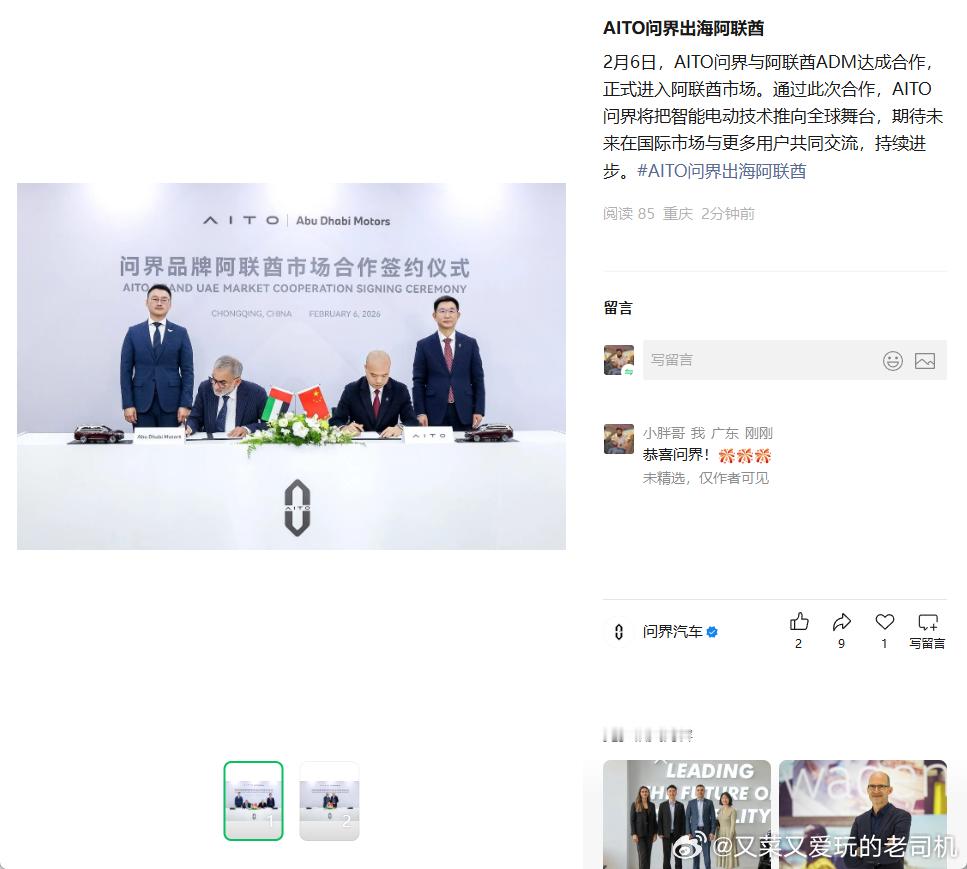 AITO问界签约阿联酋ADM正式进军阿联酋市场。注意:是以AITO问界品牌进入,而不是赛力斯品牌。