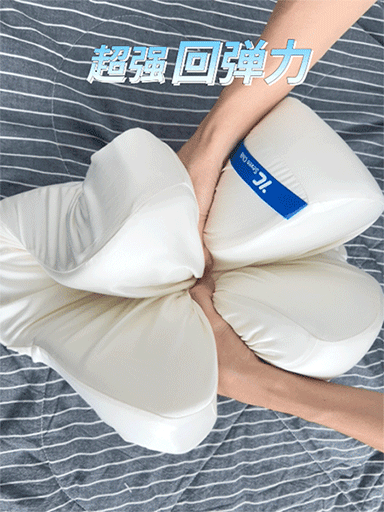 它是两边高、中间低的造型,有四大分区,超贴合头部、颈椎、肩部~仰睡的时候,有个22°斜角延展坡度,能贴合颈部,让颈椎不悬空,而且它中间是凹下去的,正好可以包裹住后脑勺,睡觉不跑枕。