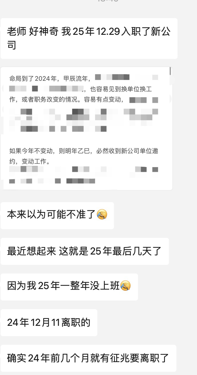 网友反馈,我之前认为甲辰年的工作变动以后,乙巳年肯定会收到新的工作邀约。然后他乙巳年一直没有找到工作,直到25年12月29日25年的几乎是最后几天才入职的新公司。有的人应得早,有的人应得晚。