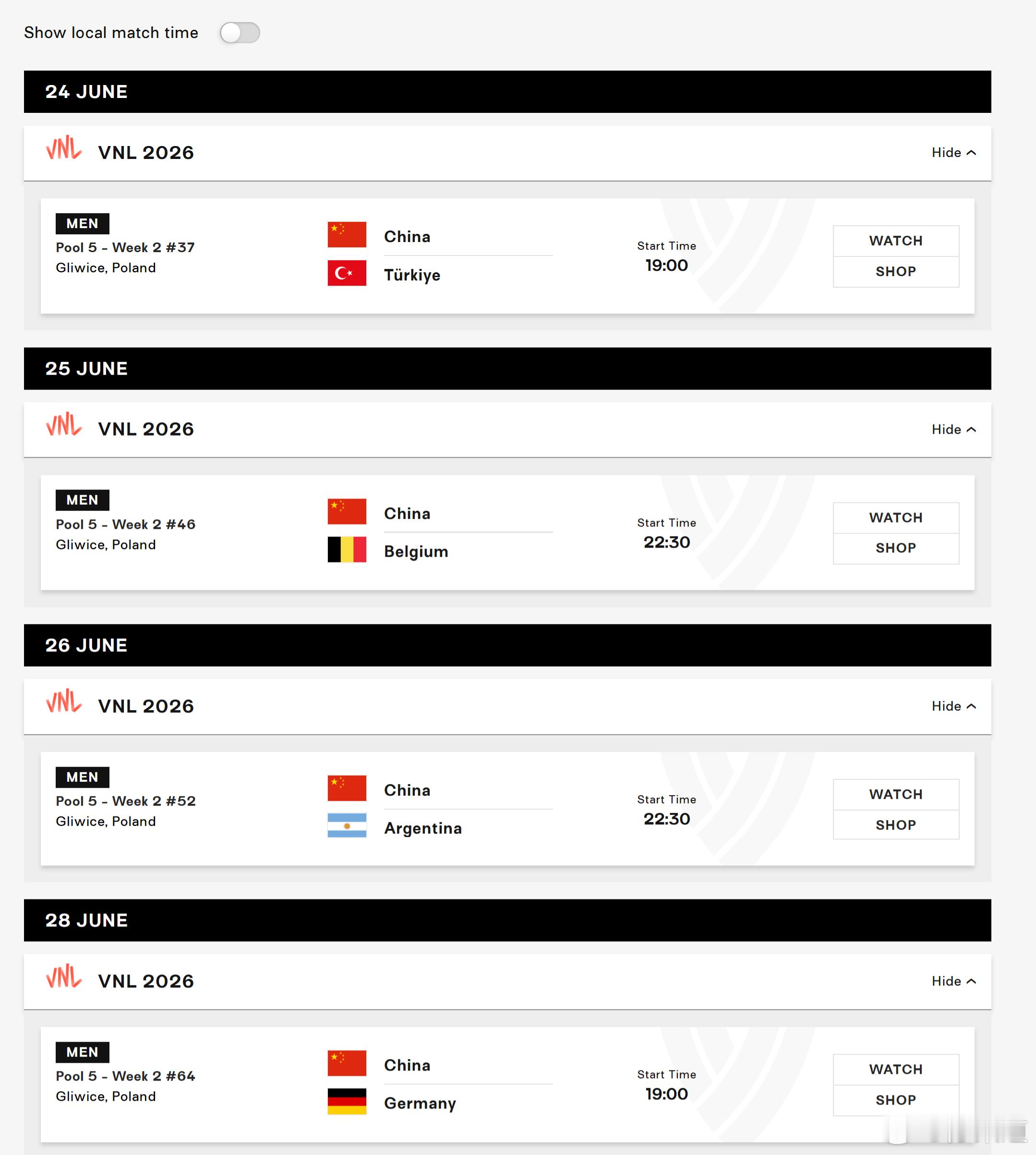 第二周(波兰格利维采)6月24日 19:00 中国vs土耳其6月25日 22:30 中国vs比利时6月26日 22:30 中国vs阿根廷6月28日 19:00 中国vs德国