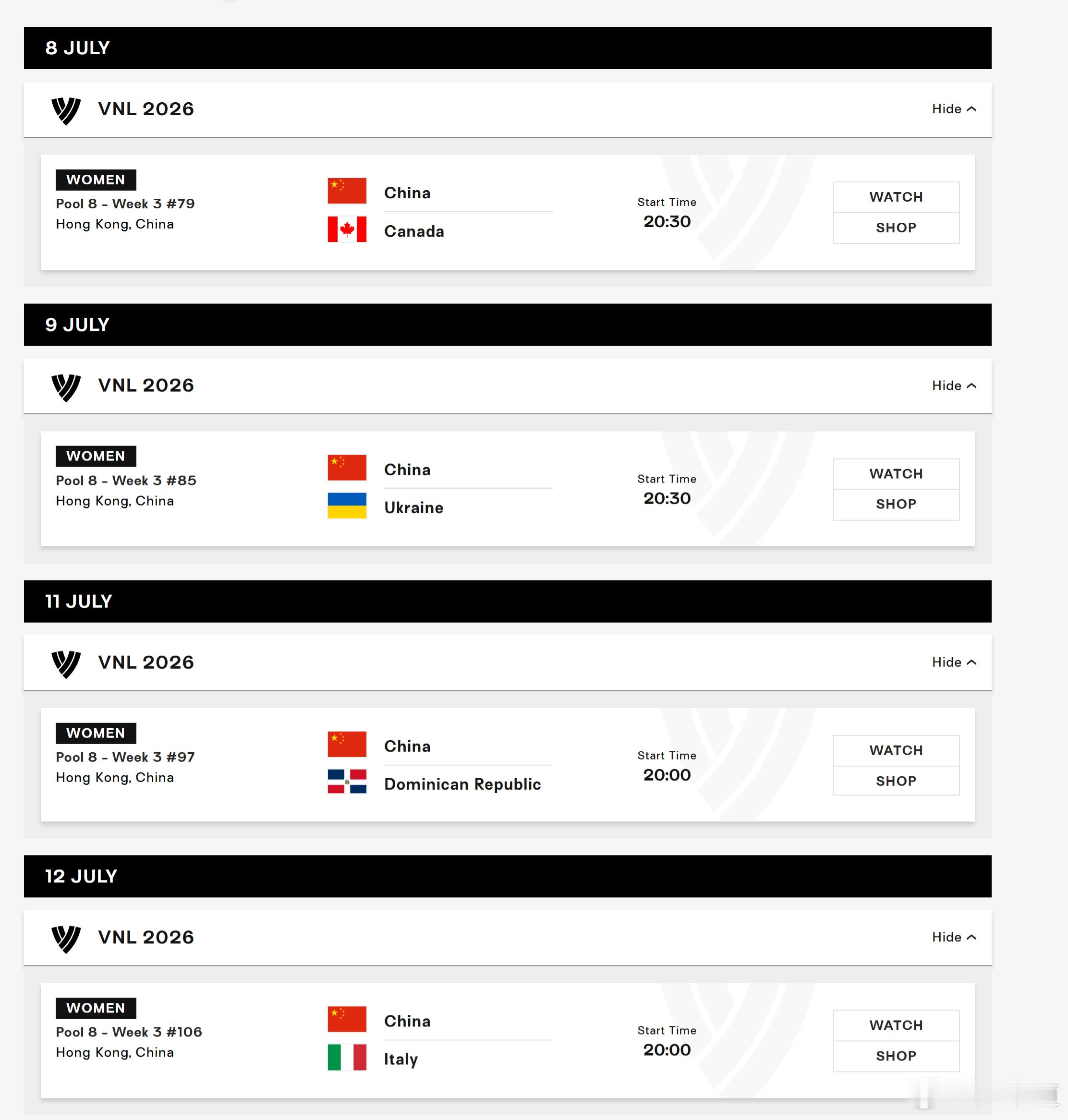 第三周(中国香港)7月8日 20:30 中国vs加拿大7月9日 20:30 中国vs乌克兰7月11日 20:00 中国vs多米尼加7月12日 20:00 中国vs意大利