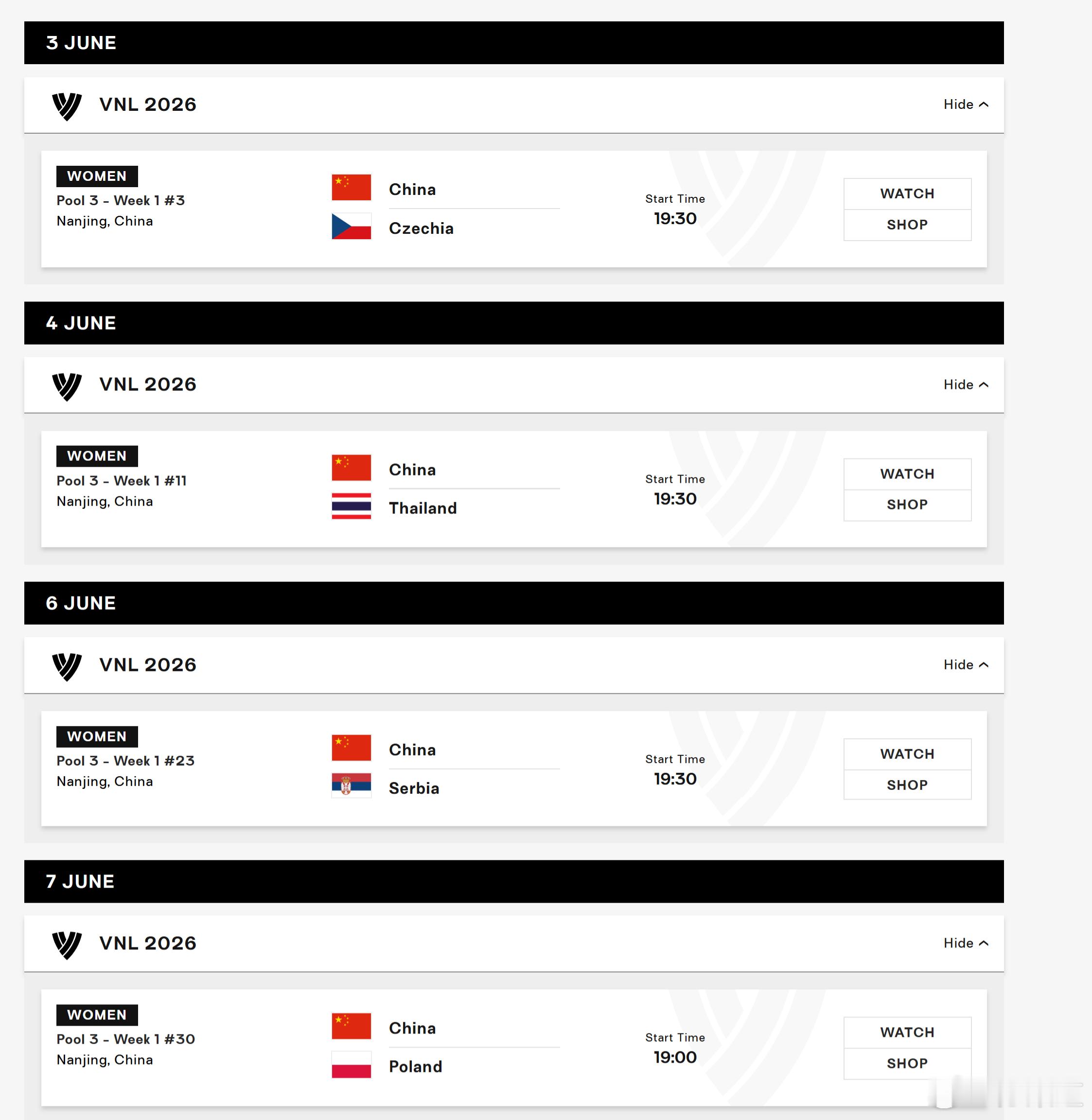 中国女排2026世界女排联赛中国女排2026VNL分站赛赛程出炉,除了第二周和土鸡,其余时间非常友好!第一周(中国南京)6月3日 19:30 中国vs捷克6月4日 19:30 中国vs泰国6月6日 19:30 中国vs塞尔维亚6月7日 19:00 中国vs波兰
