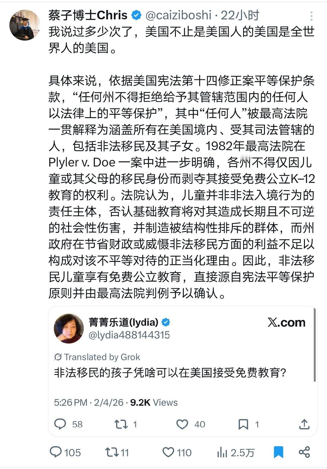 蔡子这是在鼓励“应润尽润”吗?感觉这人是从事移民中介的,不然怎么会说这么天真的话? 不过关于“美国是全世界人的”,我是相当认可的。 但不管美国是谁的,中国就是中国人的。 Source: X