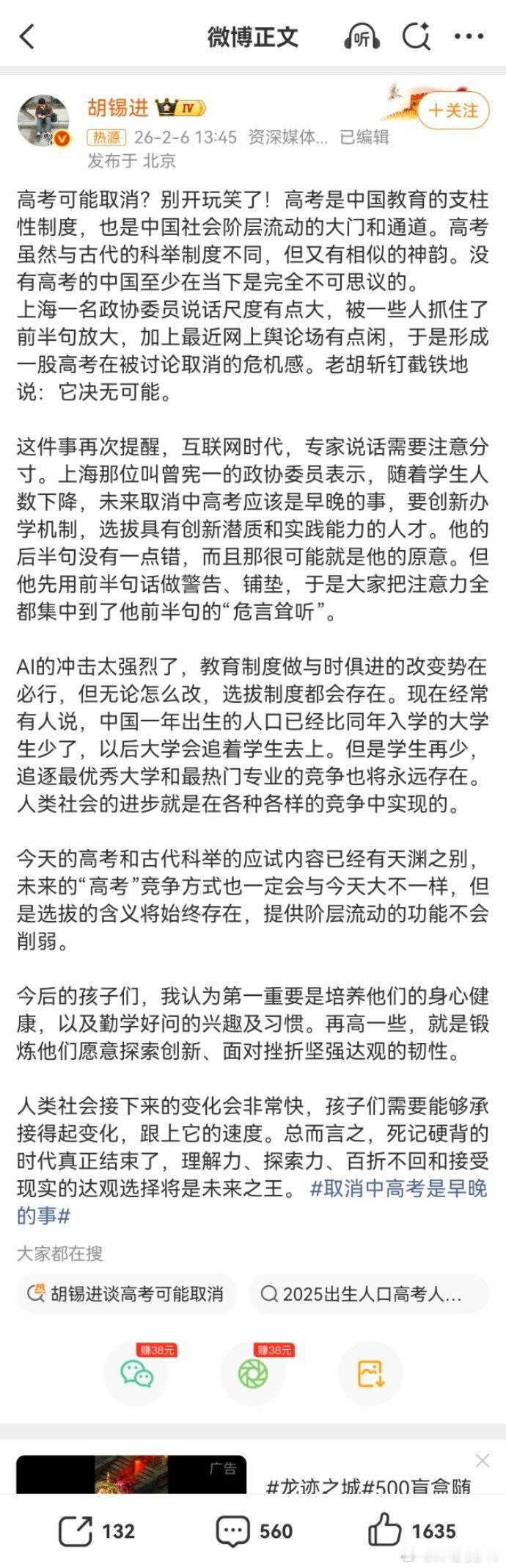 胡锡进谈高考可能取消