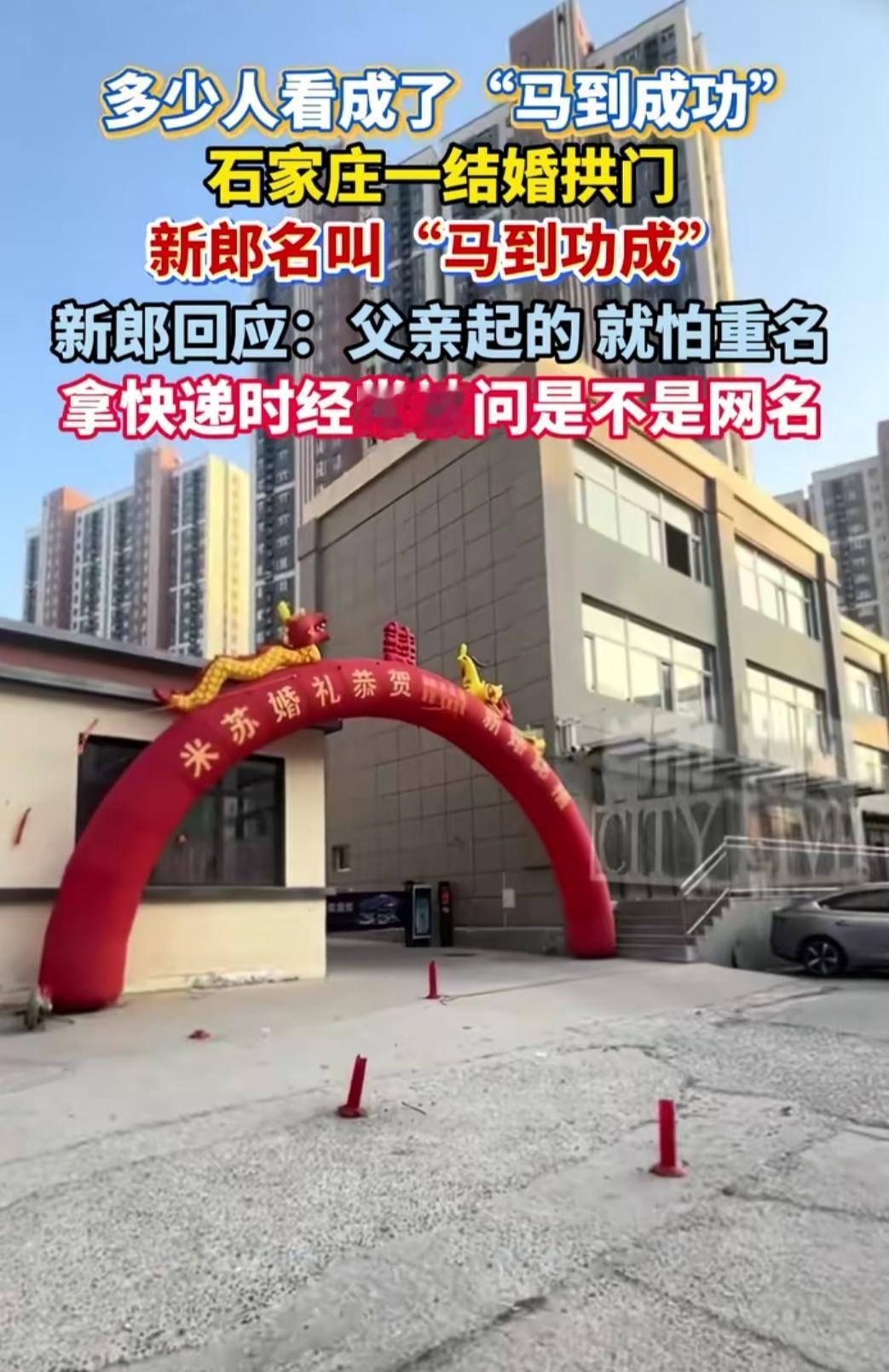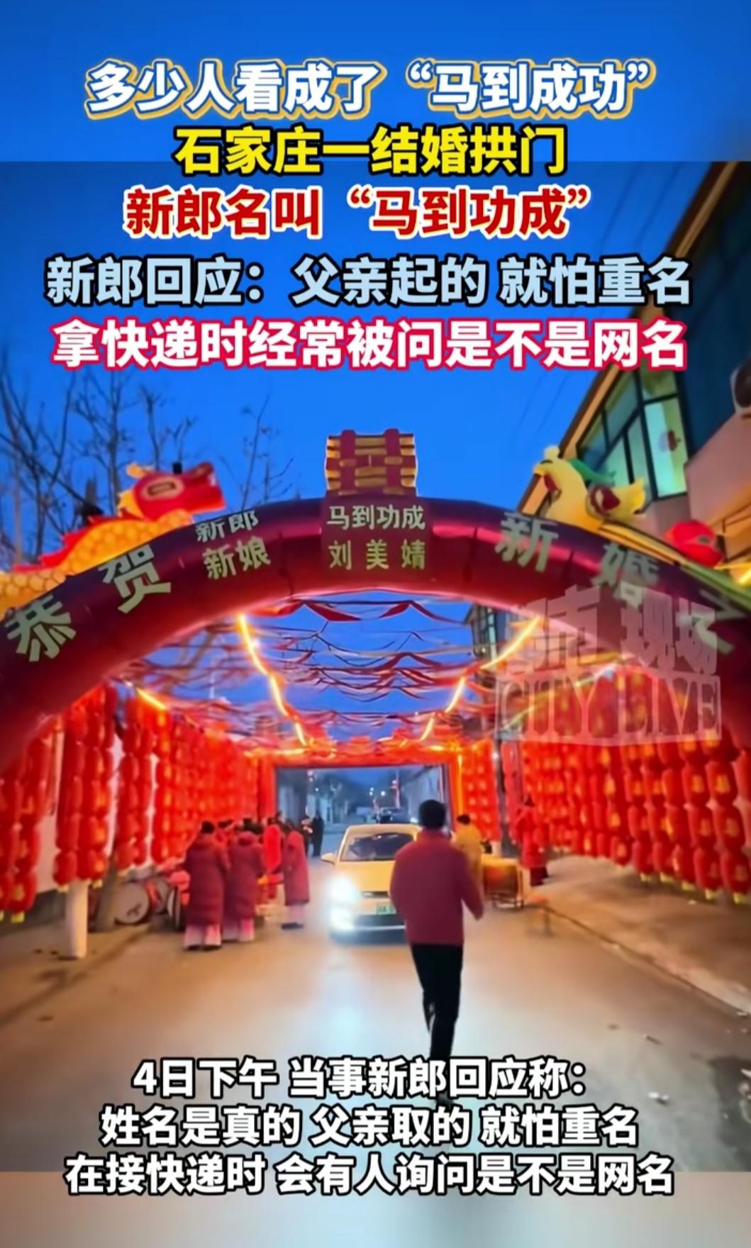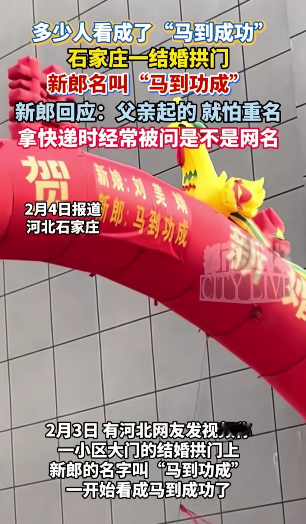 谁刷到这个结婚拱门不愣一下!第一眼瞅着还以为贴了“马到成功”的喜庆祝福,定睛一看直接笑喷,居然是新郎的真名,这名字也太绝了,自带吉祥buff,婚礼氛围感直接拉满。 河北的这场婚礼,因新郎名字意外出圈。新郎本名马到功成,和吉祥话马到成功就差一字,难怪大家第一眼都看错。 新郎还笑着回应,这名字是父亲给取的,初衷特别简单,就是怕重名,没想到反倒成了婚礼的小亮点。日常取快递还总被问是不是网名,也因这个独特的名字,闹了不少有趣的小插曲,成了专属的美好记忆。