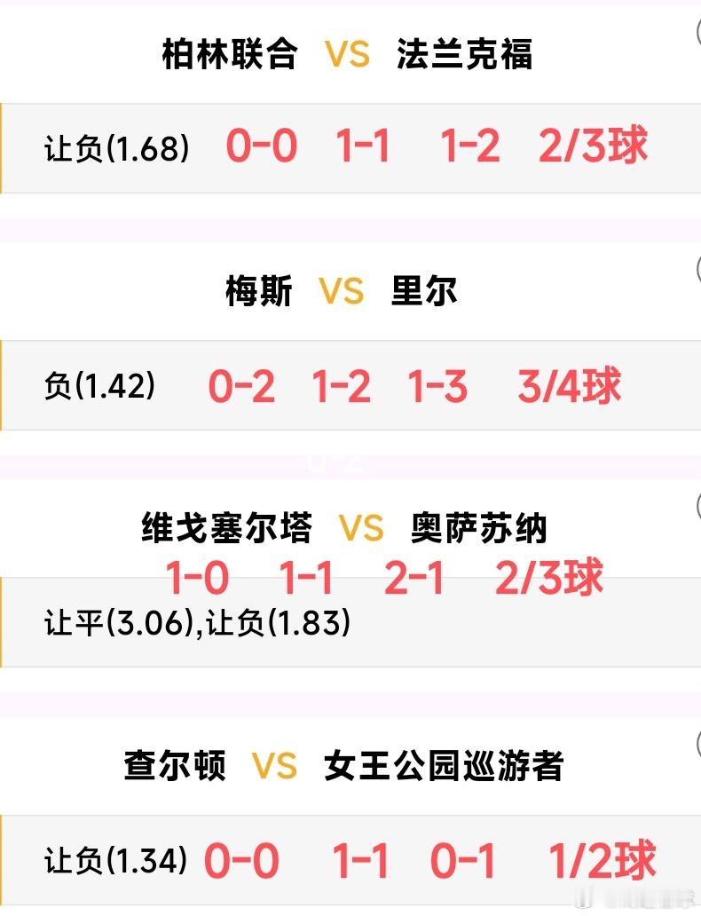 英冠:查尔顿VS女王巡游,英超:利兹联VS诺丁汉,法甲:梅斯vs里尔,意甲:维罗纳VS比萨,德甲:柏林联合VS法兰克福,荷甲:布雷达VS bv精英,荷乙:坎布尔VS阿尔梅勒,沙职:利亚胜利VS吉大达联合
