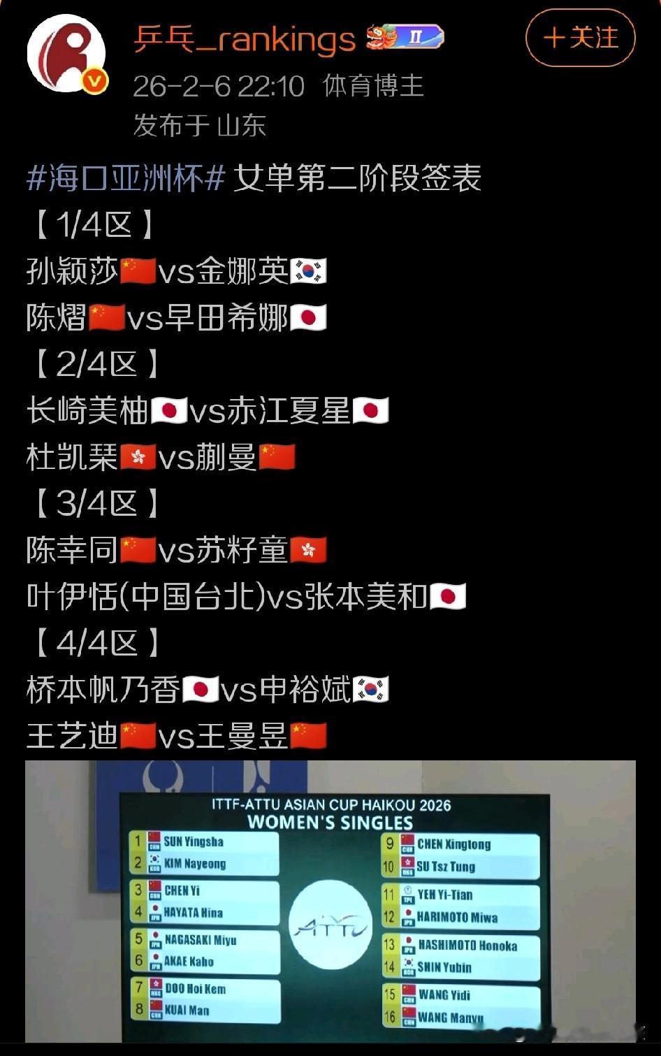 在乒乓球亚洲杯第一阶段比赛已经全部结束之后,第二阶段的16强比拼对阵也随即出炉。对于国乒女队来说,虽然球员们有人打的顺风顺水,也有人打的磕磕绊绊,甚至有人早早出现输球的情况,但是对于国乒女队来说,由于可以打三轮比拼才能确定晋级名额,还是给了球员们一定的容错空间,所以在陈熠和王艺迪都出现首轮或次轮在主要日本队对手面前输球的情况下,他们同样成功从自身的小组当中杀出来,晋级到第二阶段16强赛,也就是16进8争夺战的比拼当中。 不过相比较而言,还是第一阶段连续取得比赛胜利的几位球员看起来继续闯关的机会更大一些,而王艺迪和陈熠则都把自己送到了更强大的对手面前。特别是王艺迪,还将从原本有机会和赤江夏星进行对决,来争夺一个女单八强席位,变成了直接就要面对队友王曼昱,这对王艺迪来说当然是一种巨大的挑战。 另外,陈熠也因为在首轮输给日本削球手桥本帆乃香导致自己在成功从小组赛中冲出来之后,第二阶段一上来就要和早田希娜进行正面交锋,即使近期陈熠有过战胜早田希娜的经历,双方如今的整体竞争力也难分上下,陈熠有同样有很大概率取胜,但对于她来说,这样的强强对话毕竟也是压力很大。能否取胜基本上还是看临场发挥,双方胜负五五开或者六四开,陈熠只不过稍处优势地位。 当然,对于孙颖莎和蒯曼来说,他们各自在1/4区和2/4区需要面对的16进8争夺战的对手,分别是韩国名将金娜英和中国香港名将杜凯琹,两个人只要自己平稳发挥,都有极大概率可以直接继续前进去进行后面的八进四比赛。 而3/4区当中的陈幸同,同样拿到小组赛三连胜后,也将和中国香港的小将苏籽童进行正面对决。陈幸同只要平稳发挥,不要过于放松,就可以成为继续晋级的8强选手。而作为王艺迪来说,在4/4区当中挑战王曼昱看起来难度还是很大的,哪怕它有取胜机会,但相信状态正勇的王曼昱还是更有机会走的更远,并把自己的队友送回家。 至于其他几场没有国乒球员的比赛,在2/4区当中长崎美柚和赤江夏星的比赛也就是队友间的交锋,我们还是更看好长崎美柚能成功取胜。3/4区当中中国台北的叶伊恬和日本名将张本美和的对决,我们则更看好张本美和会成为比赛最终的胜出者。 与此同时,4/4区当中另一场日韩高手之间的对决,也就是申裕斌和桥本帆乃香之间的对话。可以说同样看点十足,每次桥本帆乃香和其他协会高手交锋都将是一场苦战。这次我们也需要看看申裕斌能否体现自己在打削球方面的综合竞争力,并通过自己的掌控力和大赛经验,争取在桥本帆乃香面前成功闯关。也帮助国乒女队清清路障。 那么,对于可能出现的乒乓亚洲杯女单最终的8强名额,您更看好哪些球员入围呢?也期待朋友们给出自己心中的答案,大家共同交流探讨。
