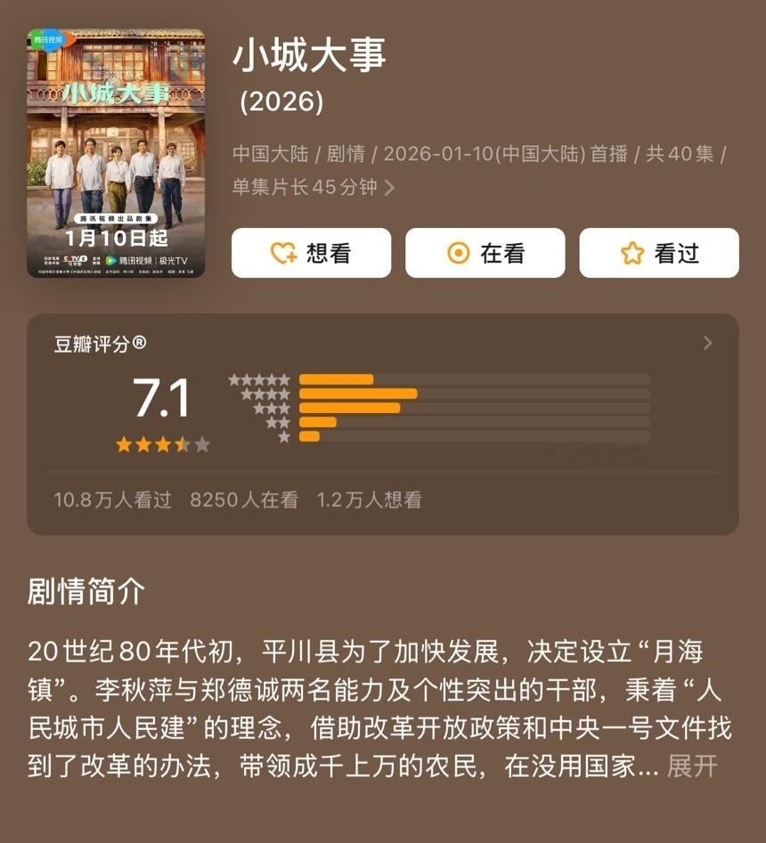 近日热播的几部电视剧开分:《太平年》7.8《小城大事》7.1《有罪之身》6.8你