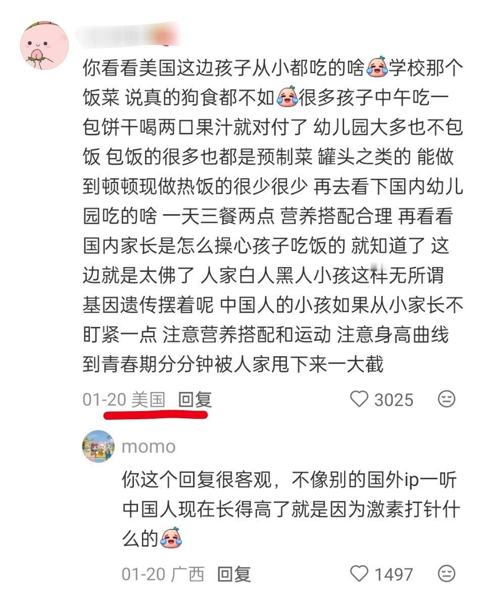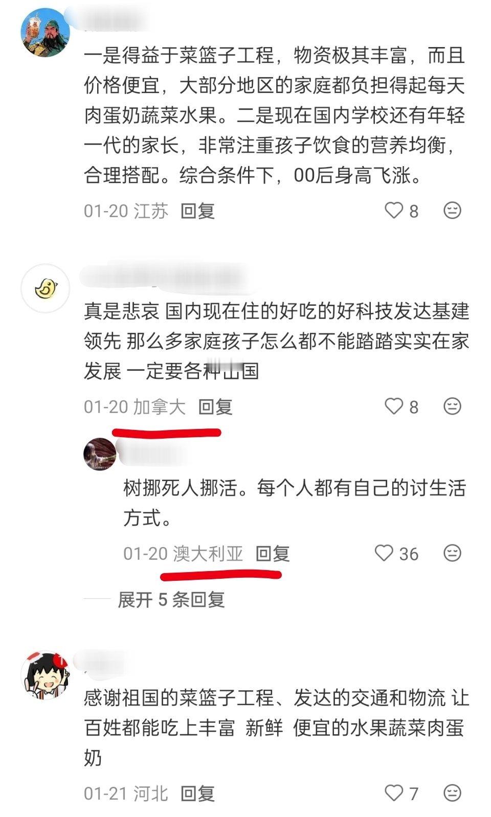 🔻为什么中国孩子比海外华人小孩高很多?🔻美国网友:因为美国孩子吃的都是预制菜和罐头,美国学校的饭菜太差了。🔻加拿大网友:加拿大的学校午餐都是零食,一些糖果,或者胡萝卜,生豌豆。🔻国内网友:因为中国有菜篮子工程。热点现场海外新鲜事
