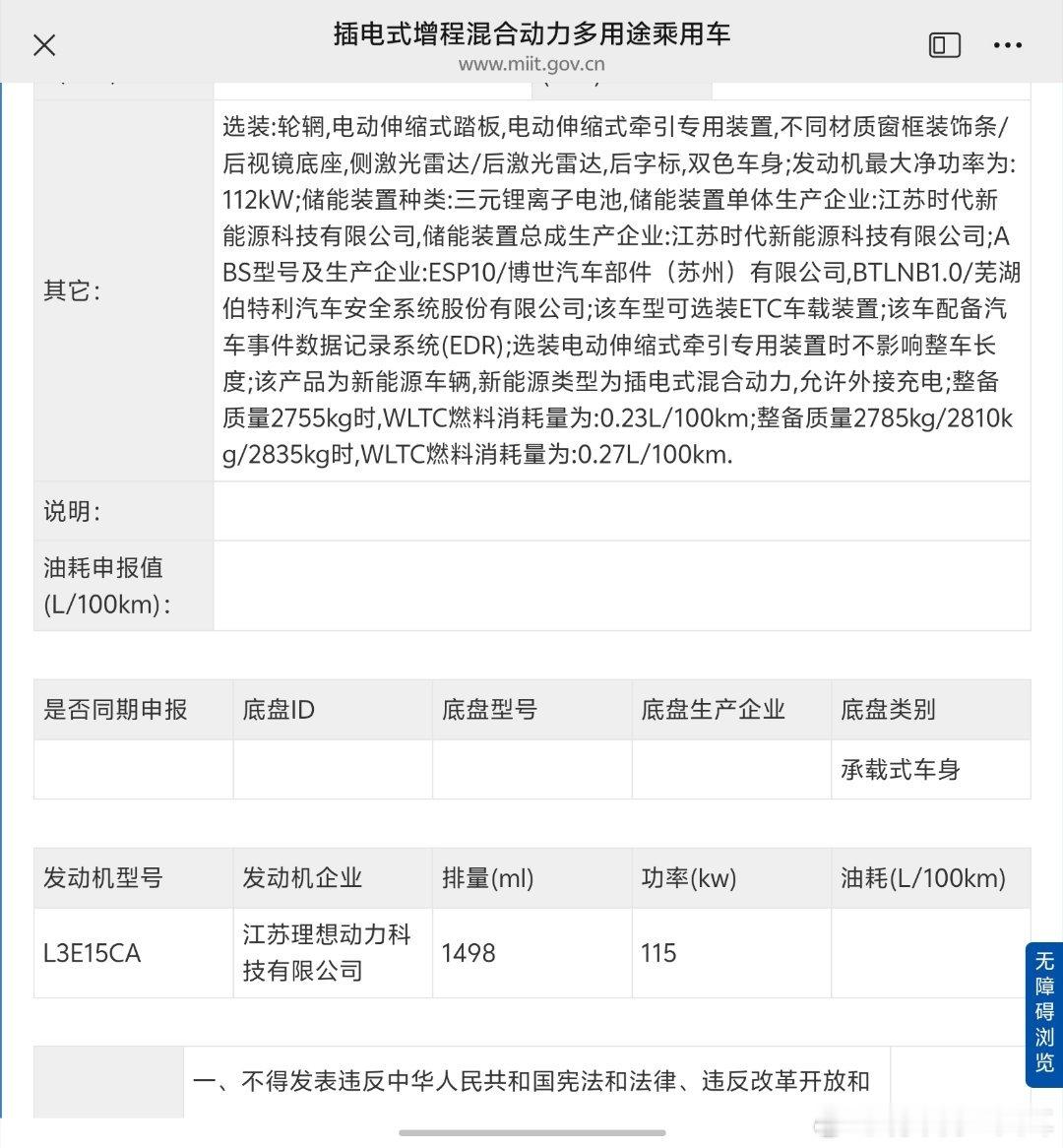 全新一代理想L9在工信部的备案信息出来了,几个改动点看着不大,事可不小:1、尺寸:老(5218x1998x1800mm,轴距3105mm),新(5255x2000x1810mm,轴距3125mm)。看数据,还想改变不大,但我悄悄说:我住顺义,见过伪装车,几毫米数据在车身上如果是三维增长,那么给我的感受就没有错——大了一个围度。就是庞然大物和庞然巨物之间的关系,不夸张;2、最高车速:以前180km/h,现在200km/h。看着就20km/h对吧,这也是围度式的改变。因为真的有网站找条跑道大家一起比加速和极速,老款L9输了,什么时候输的?180km/h以后。因为车辆限速在。这回再来呗;3、轮胎:老(265 45R21)新(Livis285 40R22)估计普通版的会用21寸车轮,但准确消息,21寸车轮也是285胎宽,并且都是米其林PS5;轮毂造型从申报图看,前两个是22寸的、后三个估计是21寸的;4、电池:品牌是宁德时代(江苏时代),72.7kWh(WLTC/CLTC~340/420km),5C倍率充电;5、预计配置差异(选装):四激光雷达、主动悬架、电动踏板、双色车身、轮圈尺寸等(今天发布的Livis版应该是拉满);5、能耗:老(WLTC 0.71L/100km)新(0.23/0.27L/100km),这个变化最夸张,但是按照目前的发展趋势,高效增程器是必须的。总结:硬件绝对强,不再性冷淡。全新一代理想l9