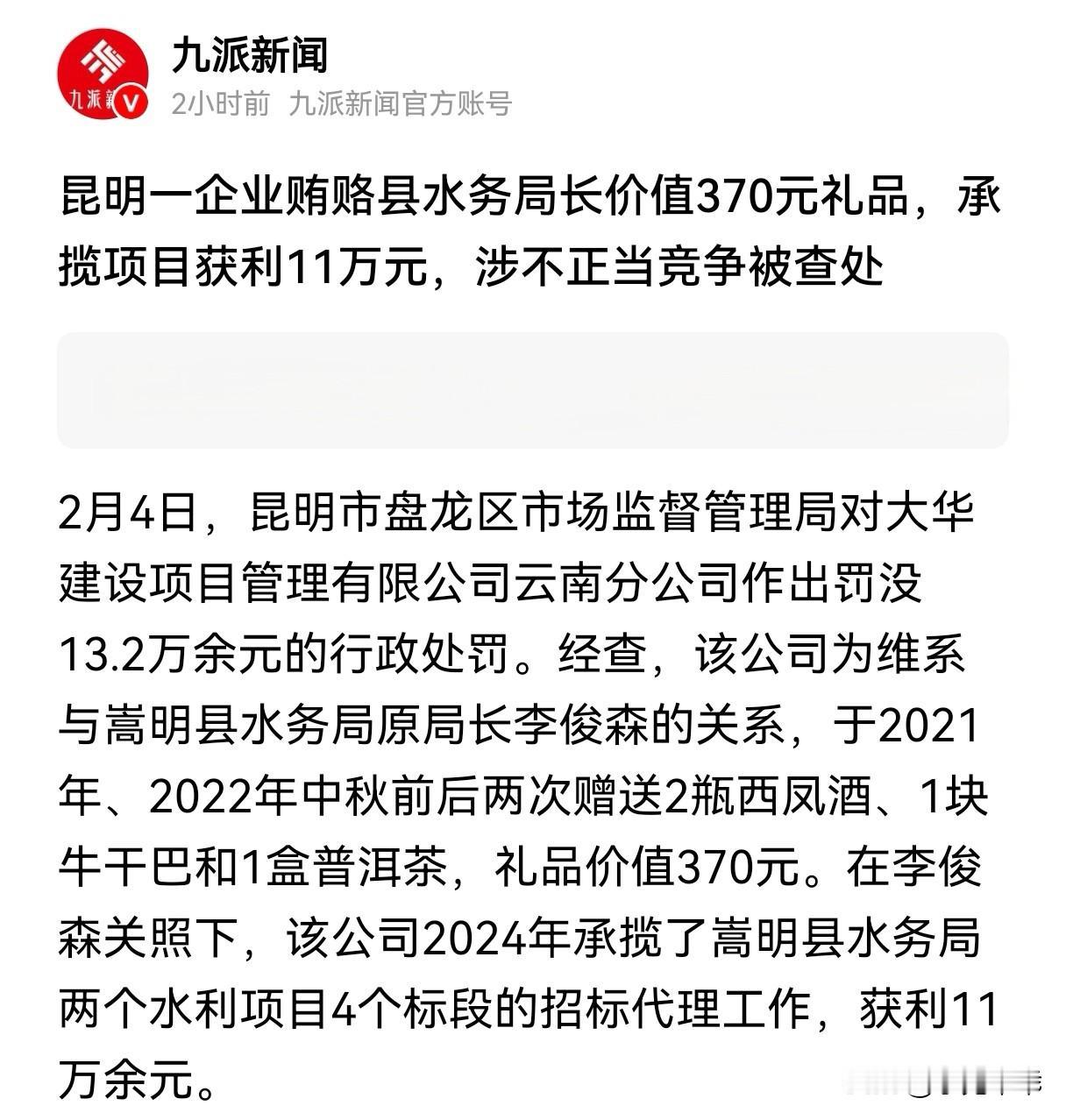 没有权力背书,谁会送你370元的“土特产”?没有利益交换,谁会给你11万的“大蛋糕”? 所谓的“礼尚往来”,不过是权力寻租的遮羞布。 370元的酒、茶、牛干巴,换来了11万的项目利润。嵩明县水务局长李俊森手里的笔,轻轻一划,就让大华公司的小投入变成了大回报。 两瓶西凤酒、一块牛干巴、一盒普洱茶,加起来还不够吃个饭,却能撬动四个水利项目标段的招标代理。 最后想问句“谁会相信?”你信或不信,它都在那里!