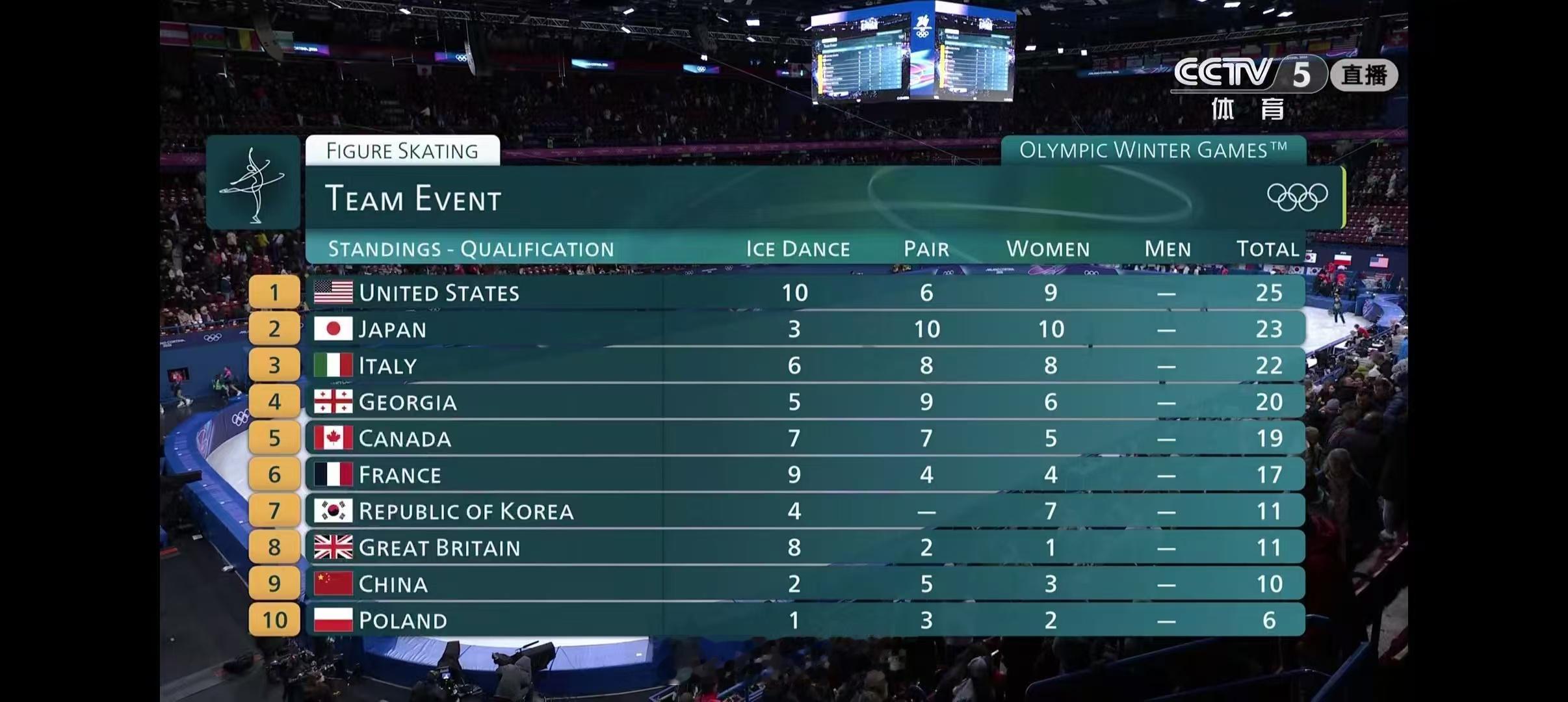 2026年米兰科尔蒂纳冬奥会 花样滑冰团体短节目第一比赛日三项结束后积分1.🇺🇸美国10+6+9=252.🇯🇵日本3+10+10=233.🇮🇹意大利6+8+8=224.🇬🇪格鲁吉亚5+9+6=205.🇨🇦加拿大7+7+5=19短节目四项结束后前五名进入自由滑6.🇫🇷法国9+4+4=177.🇰🇷韩国4+0+7=118.🇬🇧英国8+2+1=119.🇨🇳中国2+5+3=1010.🇵🇱波兰1+3+2=6中国队暂列花滑团体赛第9花样滑冰团体赛资格赛