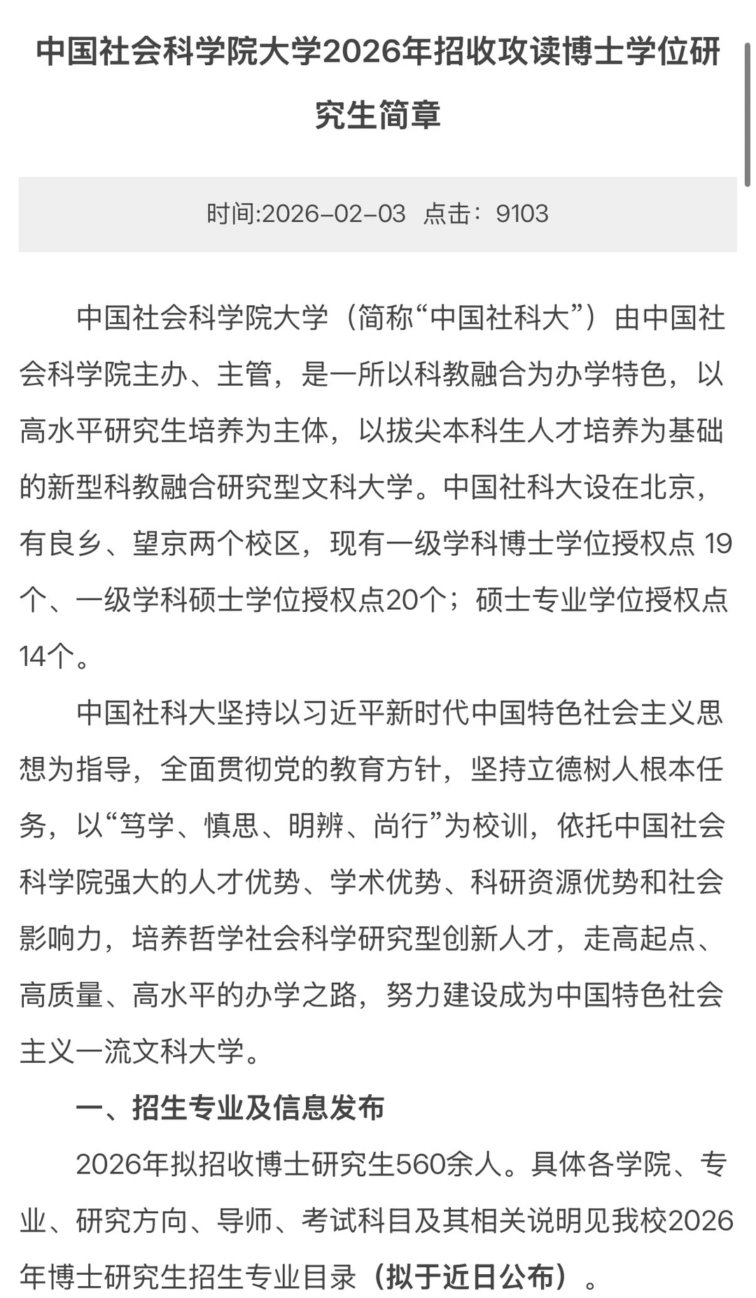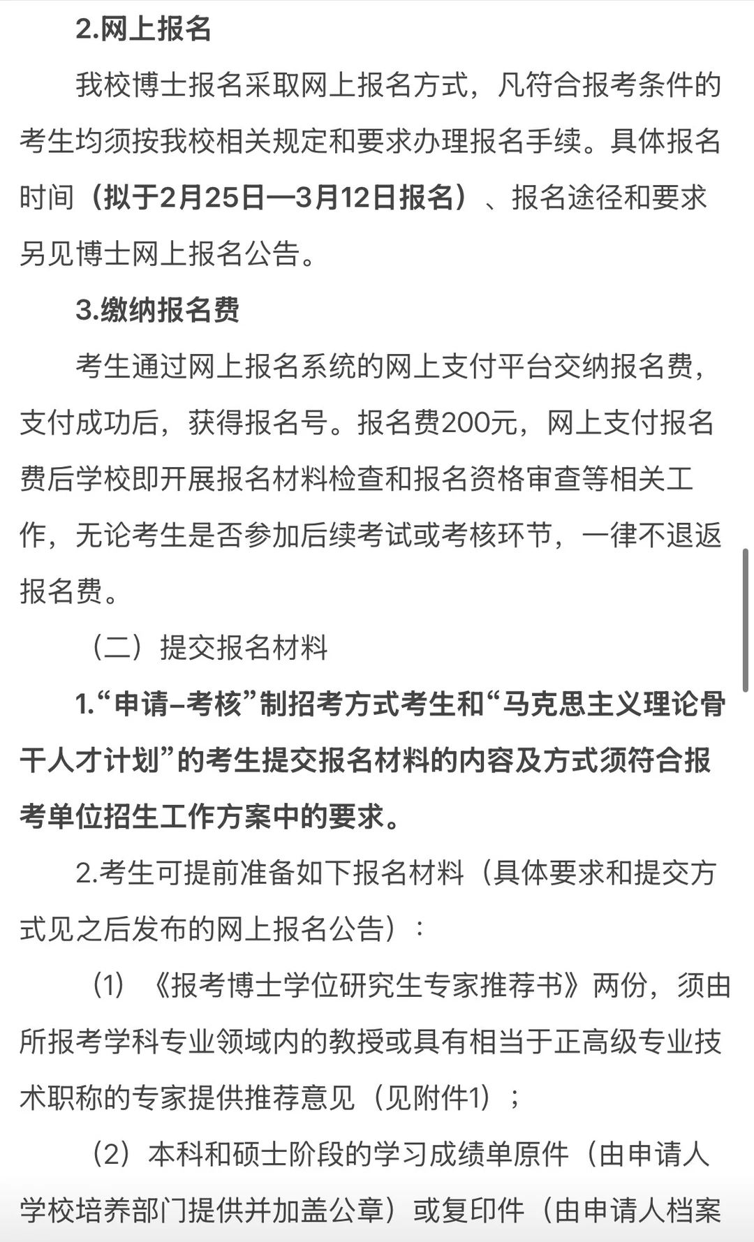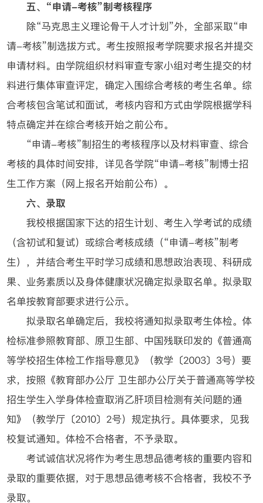一、招生专业及信息发布 2026年拟招收博士研究生560余人。具体各学院、专业、研究方向、导师、考试科目及其相关说明见我校2026年博士研究生招生专业目录(拟于近日公布)。 二、选拔模式 2026年我校博士招生的招考方式有:“申请-考核”制、硕博连读(仅面向本校硕士生)、本科直博生(已于接收推免生考试中完成)等招生模式。 “马克思主义理论骨干人才计划”有推荐考核制、硕博连读(仅面向本校硕士生)、统一入学考试等招生模式。 各学院、学科具体招考方式请参见招生专业目