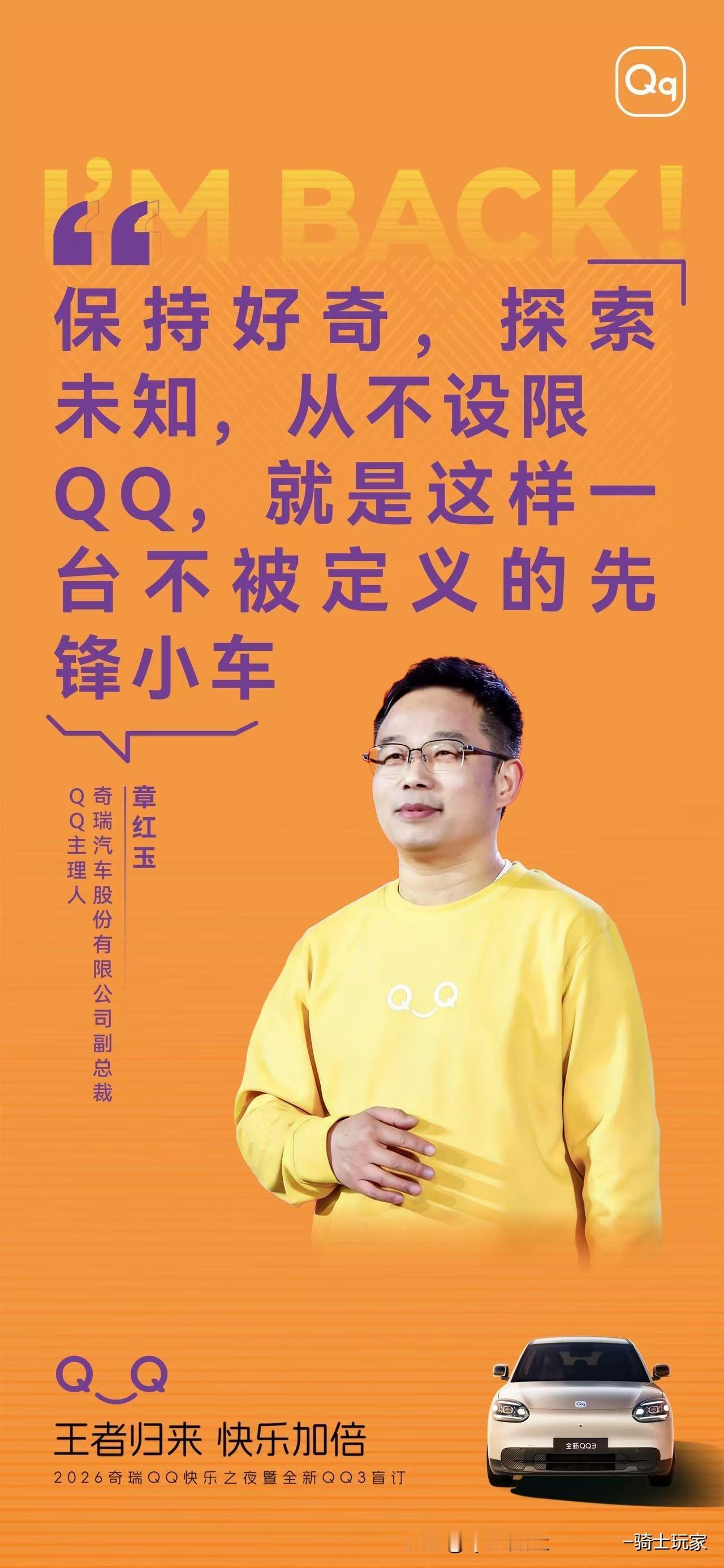 全新QQ将带着这个时代的审美、科技与乐观精神 与合伙伙伴一起走向全球,陪伴更多年轻人 去更远的诗和远方,见更美的风景 奇瑞QQ快乐之夜 奇瑞QQ回归 王者归来快乐加倍
