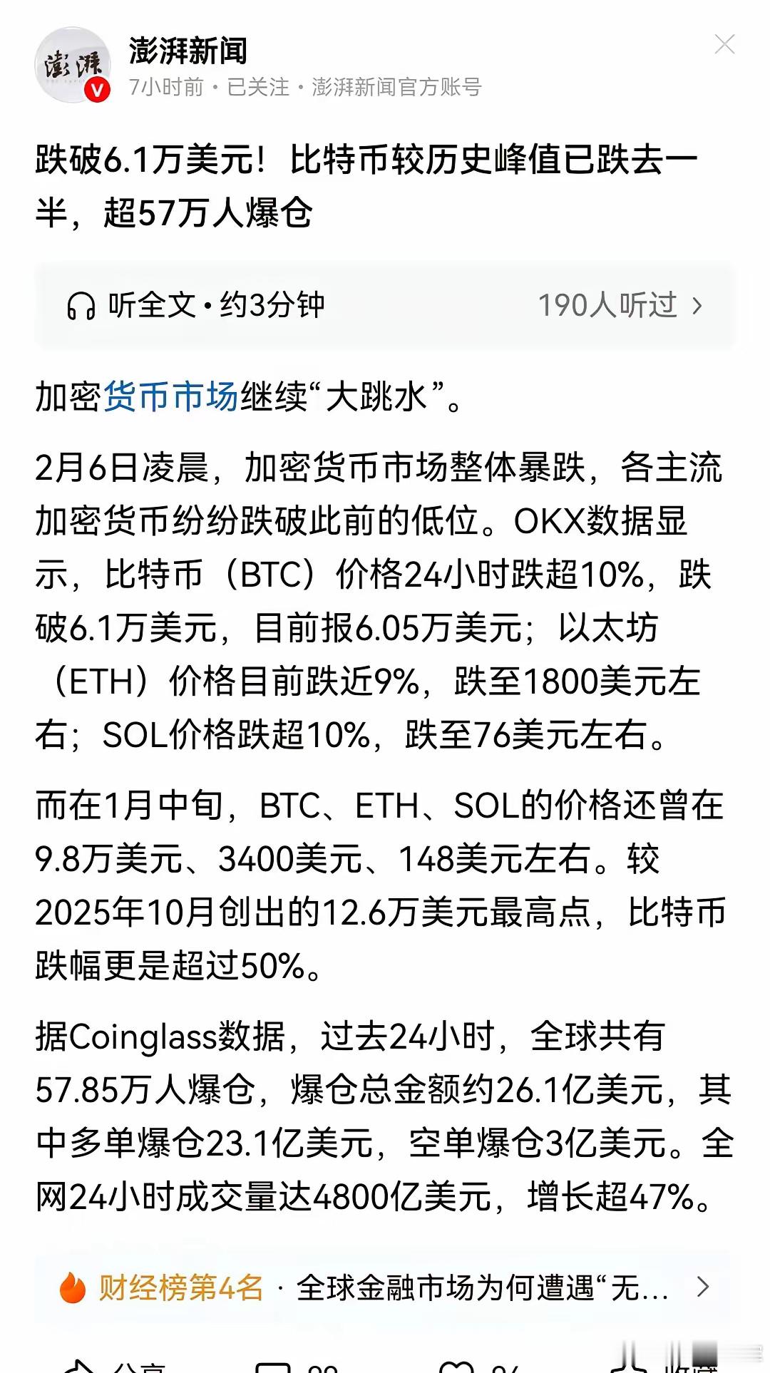 虚拟货币最近在连续大跌后,再次雪崩!比特币今天早上最低跌到了6万美元,超过57万人爆仓。比特币从去年10月份的最高126200美元跌到了今天的最低60000美元,完美实现了腰斩,相当于一枚比特币跌去了人民币46万元。而不少主流币,这两年跌幅超过90%,山寨币更是跌得几乎归零。