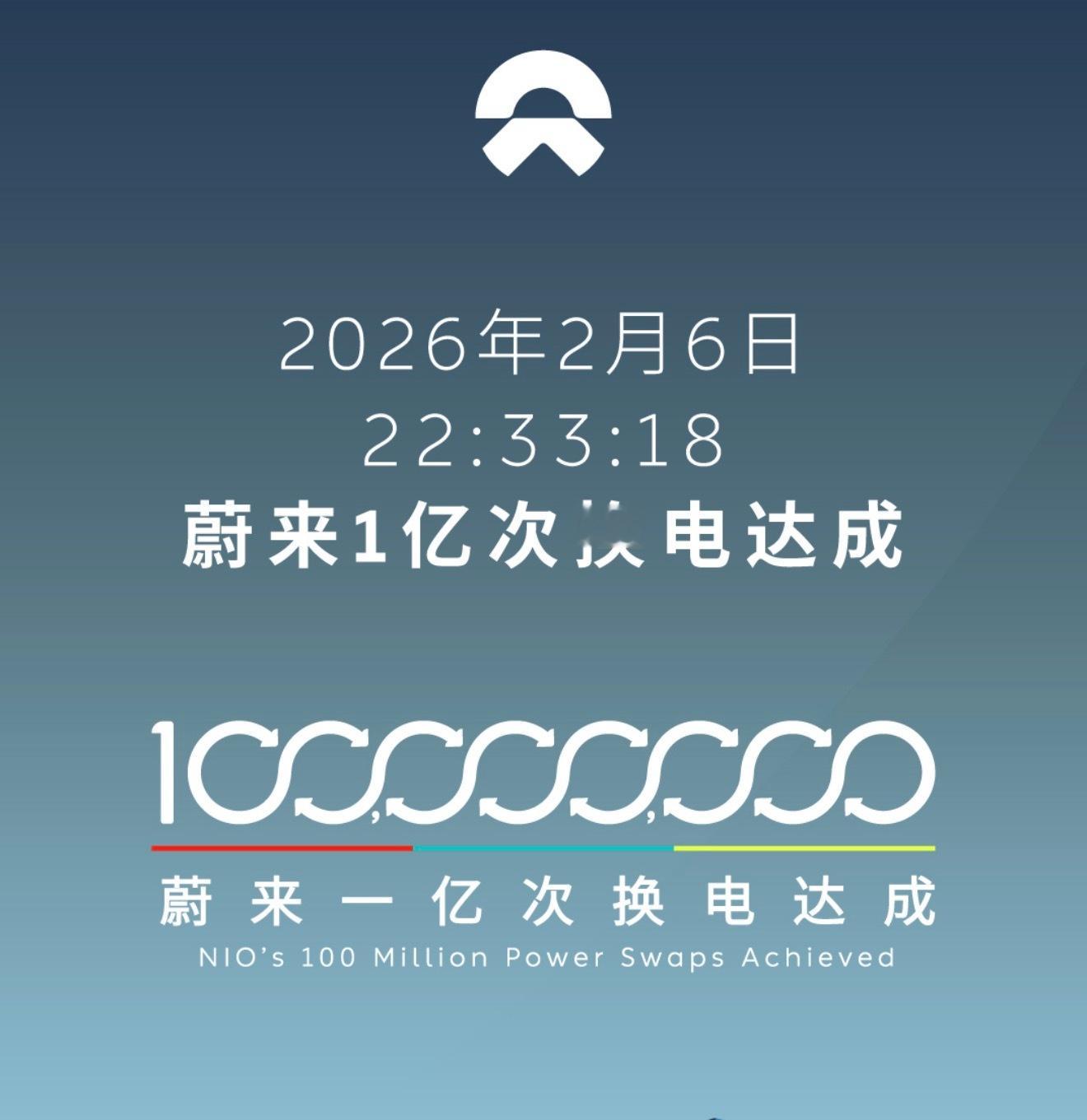 李斌称蔚来换电将突破1亿次2026年2月6日22:33:18,蔚来达成1亿次换电大关,第1亿次换电的是浙江海宁的ET5T用户,李斌当晚直播见证这高光时刻。这1亿次换电可不简单,累计电量达52.8亿kWh,省时超8341万小时,为用户省超263亿元。而且每次换电都给电池做体检,让电池健康有保障。还减少碳排放,参与电网互动,缓解压力,蔚来太给力!
