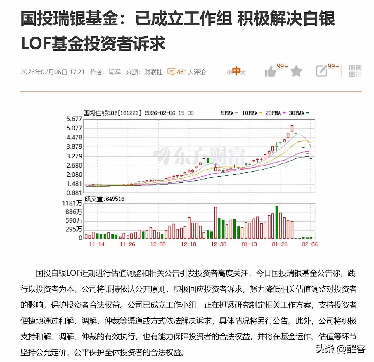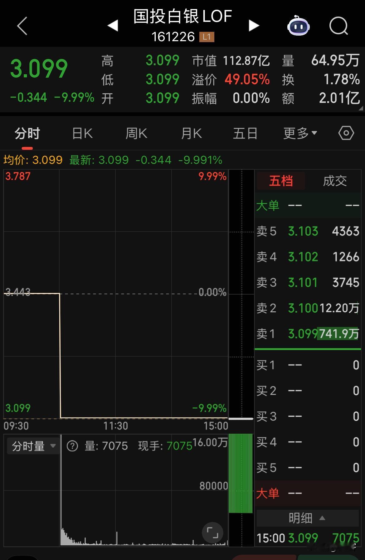 国投白银LOF继续以741.9万手封死第五个跌停板,更绝望的是溢价率不降反升至49.05%。 有很多投资者对于该基金临时手动调整估值“不讲武德”的操作十分不满,纷纷打电话举报和投诉,让基金管理方不得不成立专项组处理投诉事宜。 5个跌停板后还有49.05%的溢价实在令人绝望,除非白银价格以每天超过15%的速度涨价,否则等待持仓者将至少有3个以上的跌停板。 不过好消息确实是今日白银现货价格涨了14.57%,现价76.65美元/盎司。
