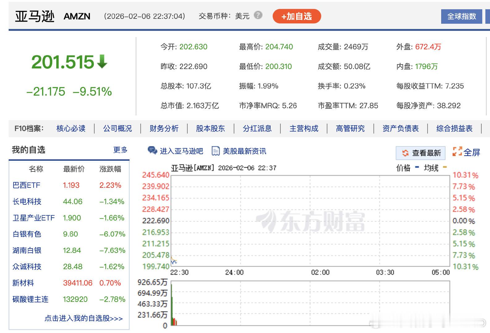 【亚马逊一度跌超10%】亚马逊开盘大跌 2月6日,亚马逊盘初跌幅一度达10%,为2024年8月以来的最大跌幅。 (财联社)