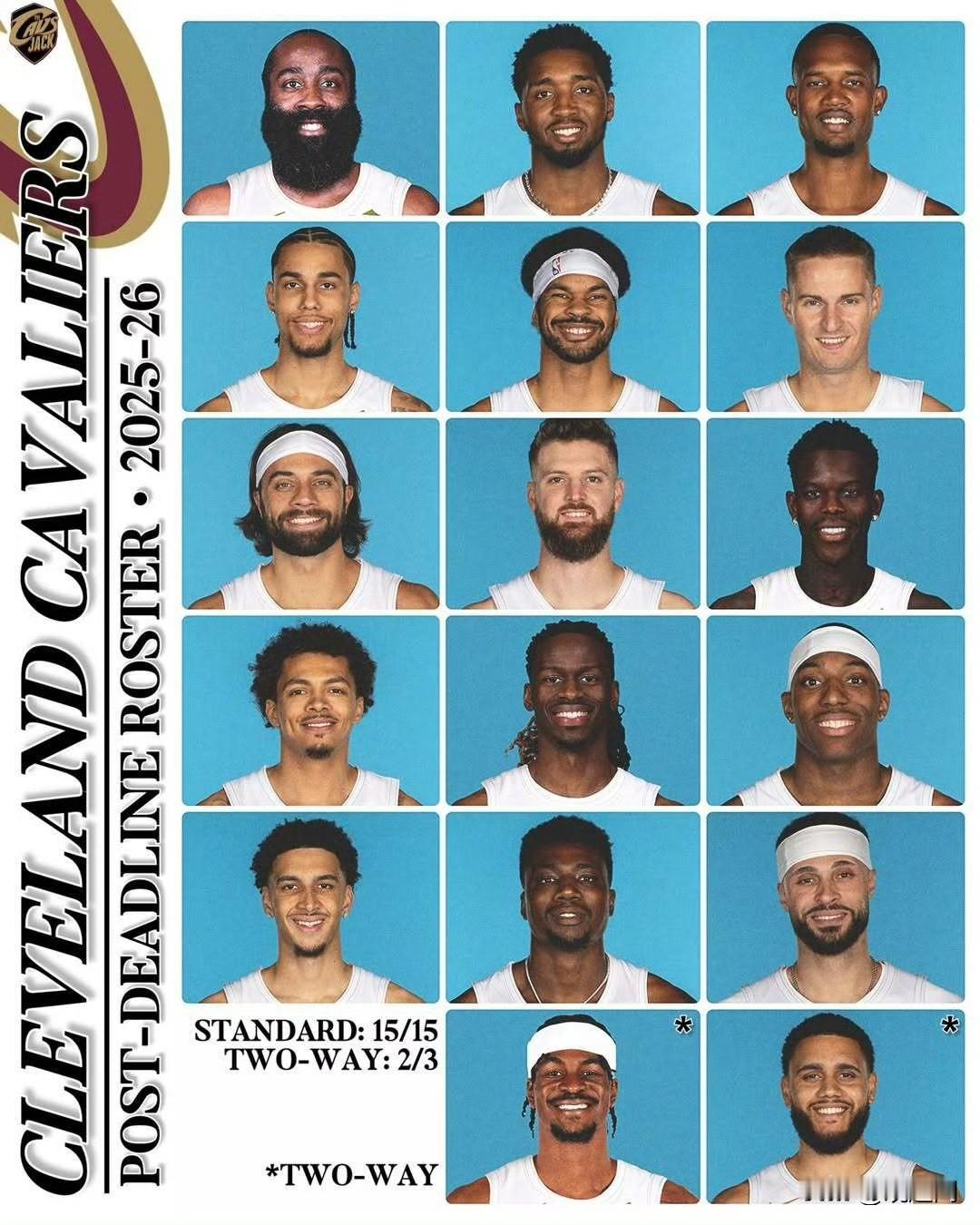 哈登加盟克利夫兰骑士队最新阵容名单」 后卫:哈登、米切尔、梅里尔、施罗德、埃利斯、波特、普罗克特、斯特鲁斯 前锋:泰森、汤姆林、韦德、小南斯 中锋:阿伦、莫布里、拖布 双向球员:米勒(前锋)、埃纳鲁纳(前锋) 正式名单15人,双向球员2人。 哈登+米切尔进攻端无死角,莫布利+阿伦防守端顶级。后卫线拥挤,可靠锋线轮换少。不过,阵容平衡性依旧不错。在东部能干一干。哈登