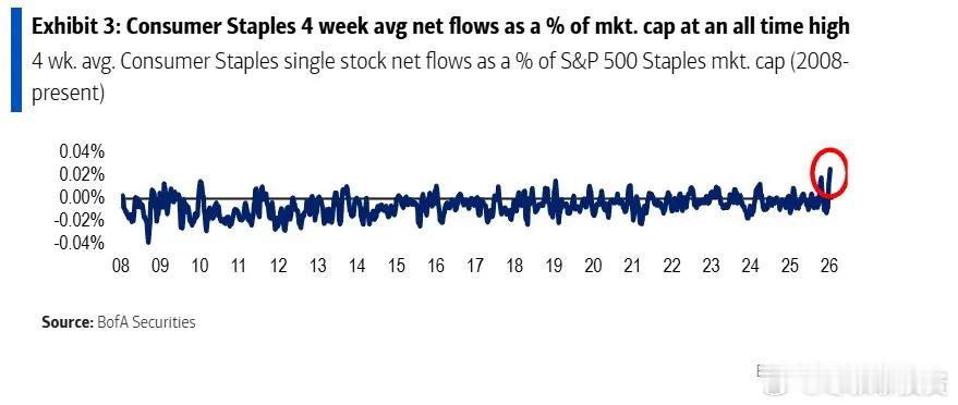 必需消费品行业的四周平均净流入资金占市值的比例,在2026年初冲上了自2008年以来的历史最高点(图2)