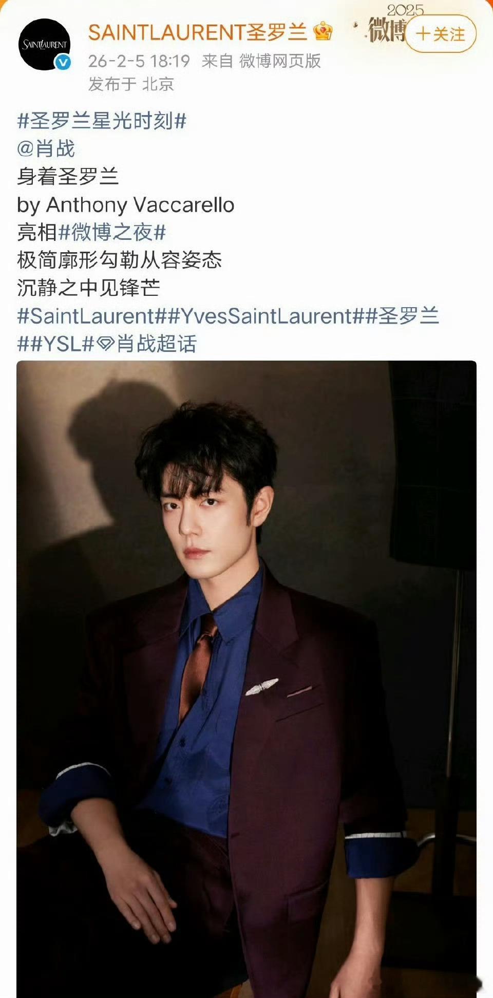 YSL男明星造型上身只认领了肖战,并且微博之夜后第二天今天又单发了一条,含金量拉满